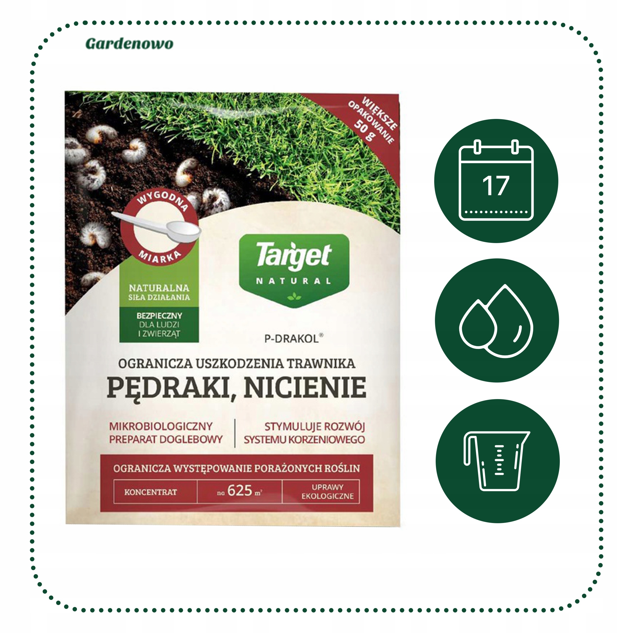 p-drakol натуральний, мікробіологічний підготовка проти грубів, проводів та нематод ґрунту; містить найвищу концентрацію корисних бактерій на ринку! Використання P-драколу покращує здоров'я, якість та зовнішній вигляд газону: зменшує виникнення заражених рослин, запобігає утворенню дефектів на газону , покращує розвиток кореневої системи, зменшує ризик паралічу з патогенами, що передаються нематодами. Продукт не містить штучних речовин - він повністю безпечний для людей, тварин та рослин; можна використовувати в екологічних культурах.