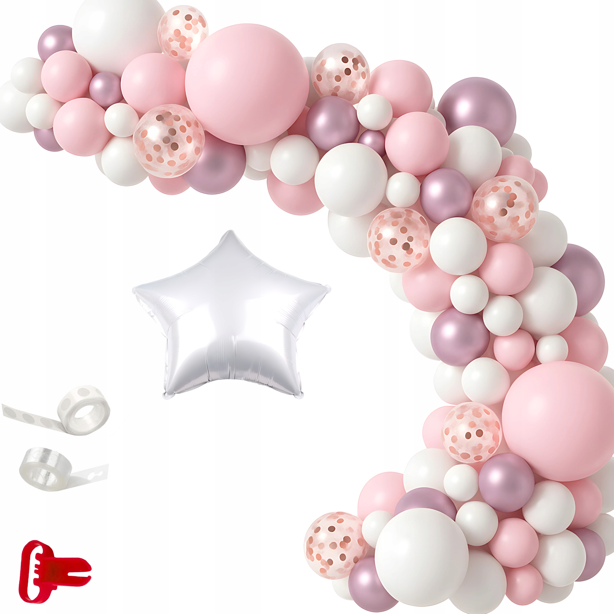 ⭐ The most set includes: h1> - 105 balloons in shades of pink, white, purple, and transparent with confetti in the middle with a diameter of 13 cm to 46 cm