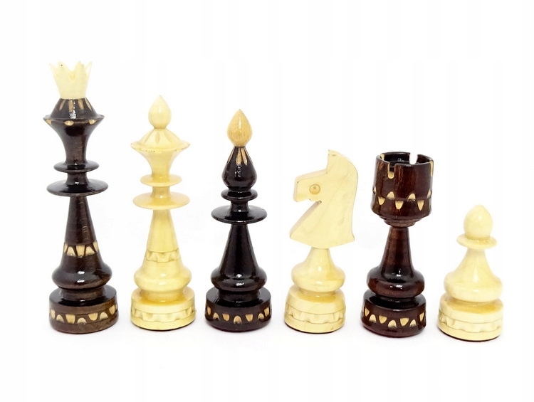 Набір із 32 великих дерев'яних шахових фігур, прикрашених різьбленими візерунками, виготовлений вручну в Польщі з високоякісної сировини.