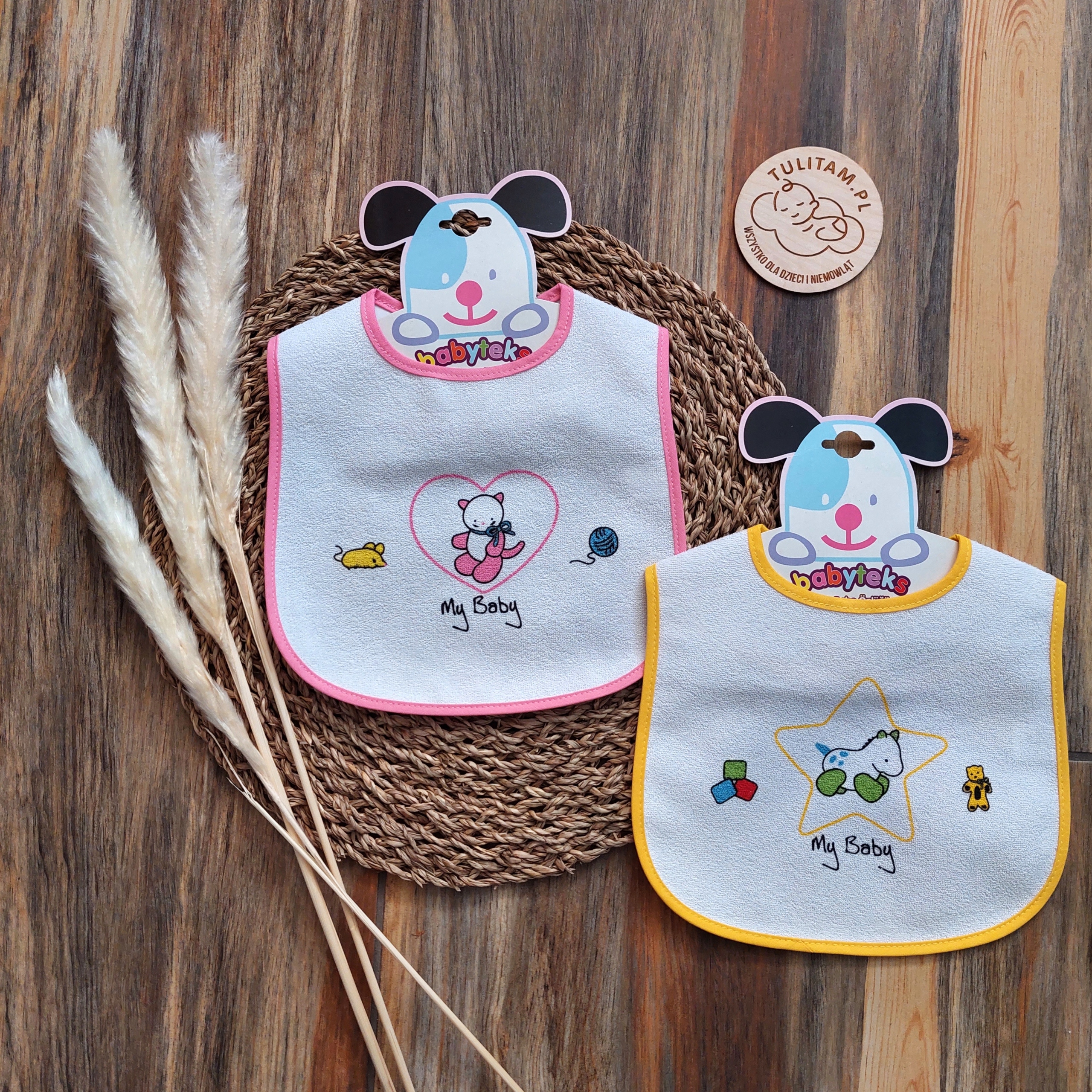 Бібки виготовлені з високоякісної бавовни Terry, яка ідеально просочується і в той же час м'яка і приємна. Внутрішній шар є водонепроникним, завдяки якому він захищає одяг від бруду. Бібки кріпиться на липучках, що дуже зручно та практично у використанні. Бібки оброблені бавовною, а барвисте застосування спереду приємне для очей і робить дитину приємнішою під час годування.
