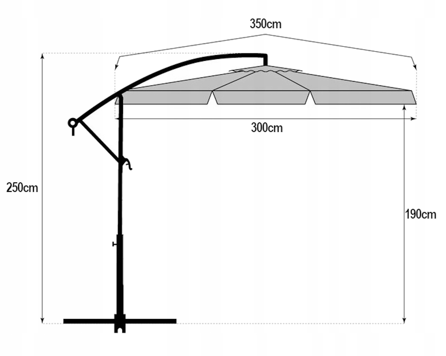 - розміри: висота 250 см; діаметр навісу, виміряний на матеріалі, 350 сантиметрів