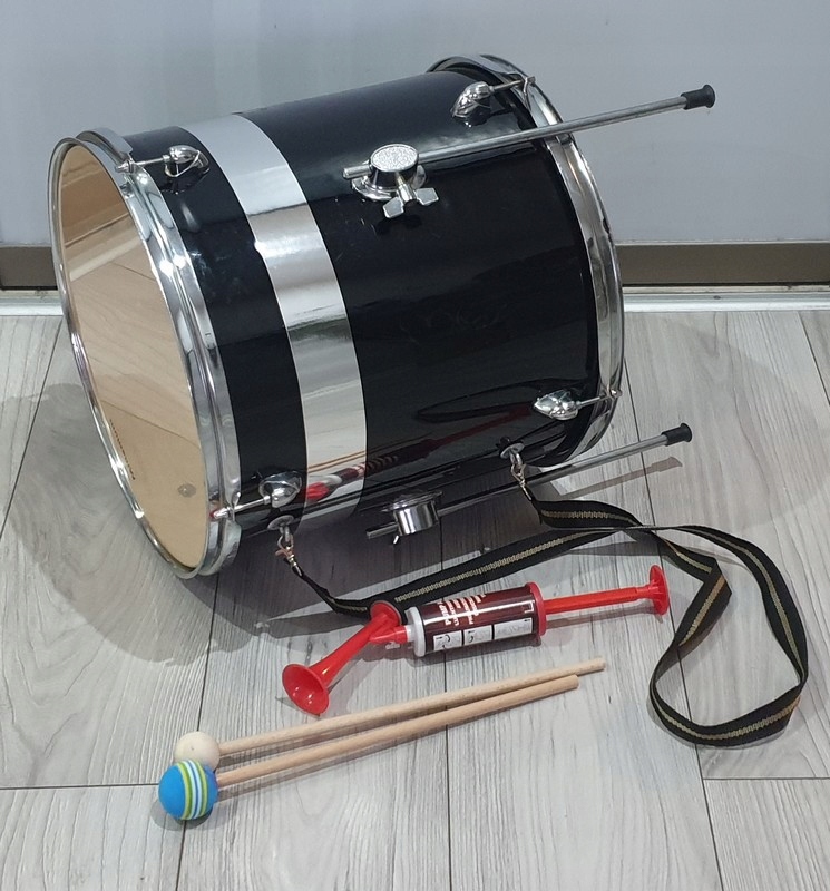 includes a strap, two sticks, a support trumpet and a drum tuning key and noses visible in the pictures