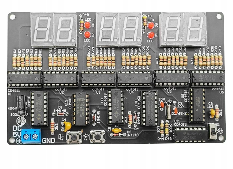 Цей продукт — це схема 24-годинного цифрового годинника, яка використовує такі мікросхеми, як CD4518, CD4511, CD4081, CD4013, CD4060 тощо. Схема не містить мікроконтролера, тому немає програми, а години, хвилини та секунди можна відкалібрувати без функції будильника.