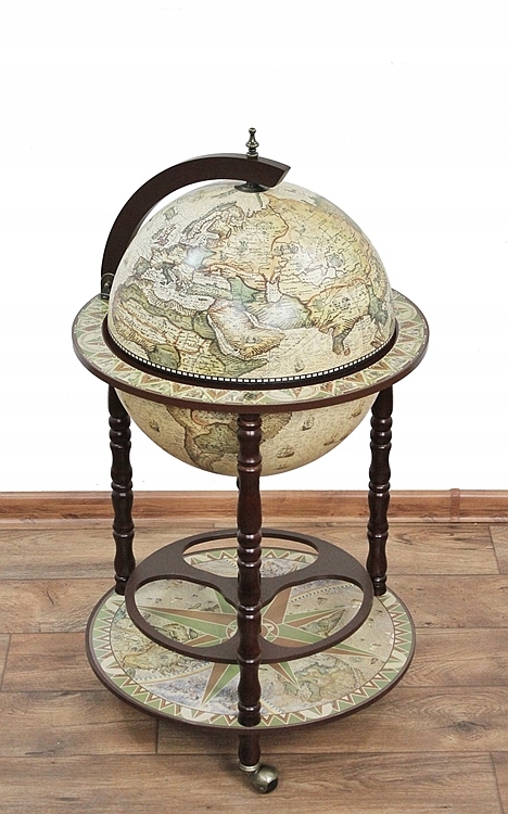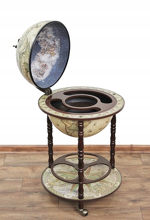 Стильна річ, яка стане ідеальним подарунком. Це дуже практично і функціонально. Всередині відкривається кулі є місце для пляшок і склянок. Нижня полиця має профільовані затискачі для пляшок. Штанга має поворотні колеса на шарикопідшипниках.