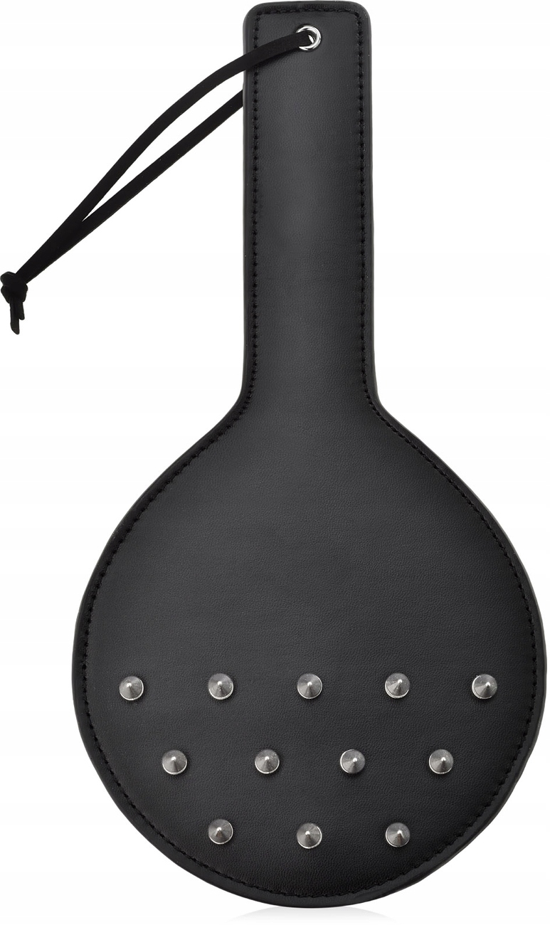 Велика шкіряна бдсм-муфта. Двосторонній шльопанець з шипами, ідеально підходить для шльопання та покарання. Міцний, добре лежить у руці, має петлю для зручного тримання та зберігання. Набір ідеально підходить для розігрування сценаріїв БДСМ. У той же час це дозволить м'яко бити гладкою стороною і сильніше тілесно покарати стороною з металевими шипами. Патсі сподобається як поціновувачам ігор з елементами домінування та підкорення, так і любителям, які бажають привнести в спальню якусь чванливість.