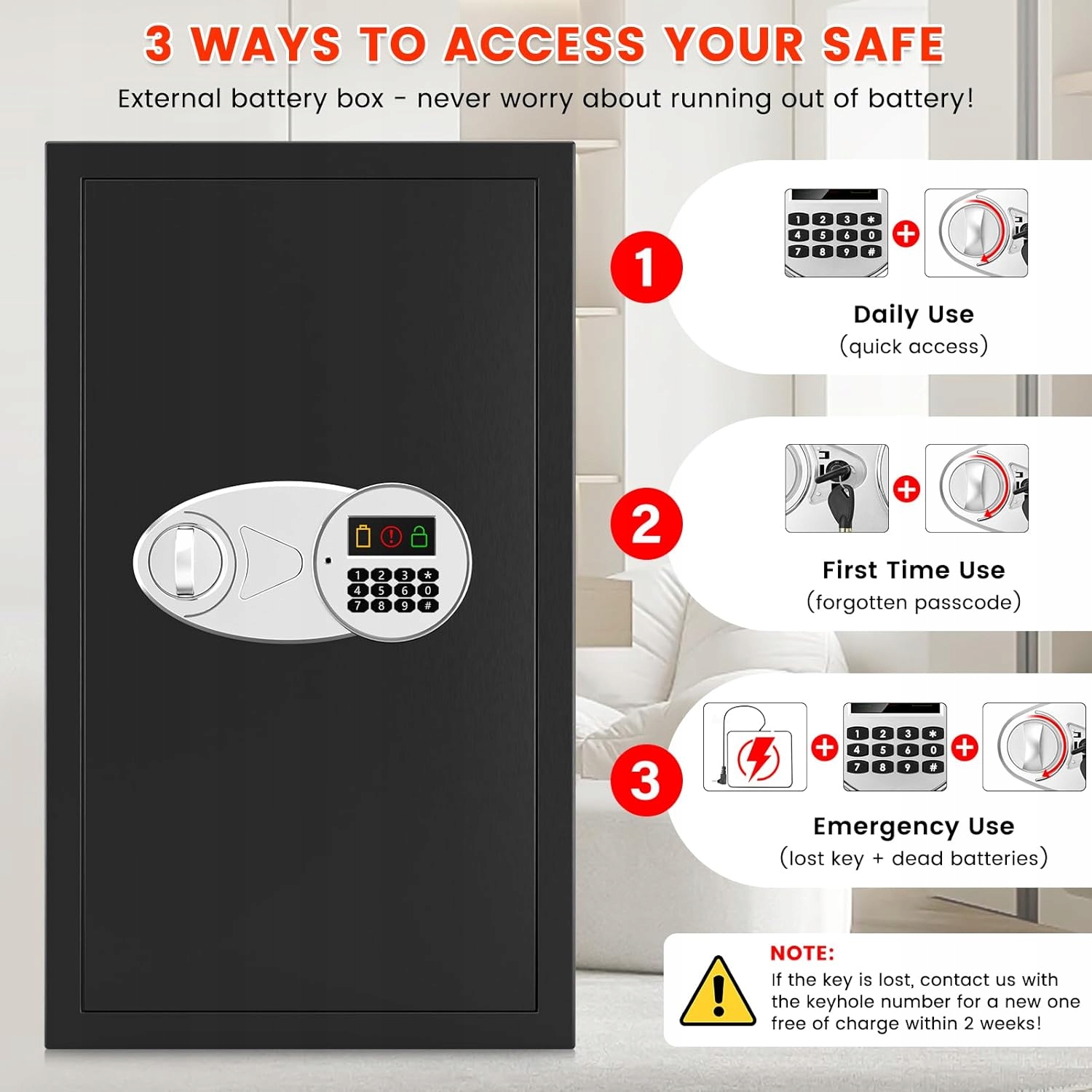 Завдяки трьом методам розблокування та тривоги, що розбивають, ваш сейф завжди готовий надати вам спокій. Проста установка на стіні або підлозі збільшує безпеку вашого будинку чи офісу.