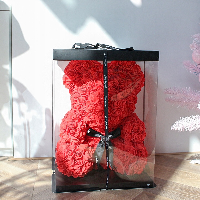 ⭐ Наш ведмедик упакований в декоративну ПВХ коробку, яка зібрана. Товар вже перев'язаний чорною стрічкою, тому після замовлення подарунка Вам не потрібно нічого робити - просто подаруйте коханій людині!