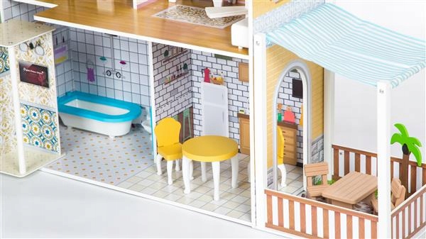 - Триповерхова будівля з терасою, кухнею, ванною кімнатою, ліфтом, кімнатою з великими сходами, вітальнею, спальнею, балкон і набір меблів. ідеальне місце для відтворення повсякденного життя ляльок.