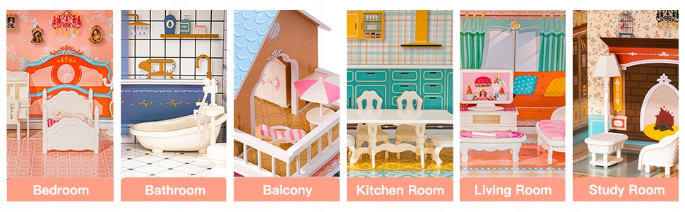 Для більшої реалістичності меблі зроблені з пластику. Дверцята шафи можна відкрити. Білий і рожевий кольори витончені, і діти теж оцінять ці два кольори. У кожній кімнаті є меблі, діти також можуть облаштувати кімнати меблями за власним уявленням. Вам більше нічого не потрібно, ми вважаємо, що аксесуарів достатньо для рольової гри.