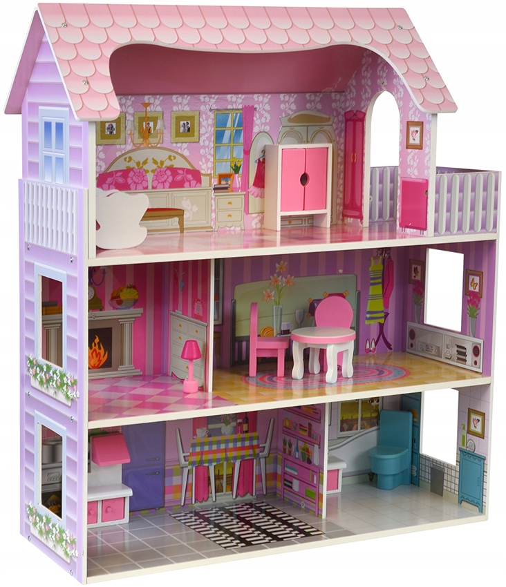 Міцна, дерев'яна конструкція дозволить насолоджуватися грою протягом тривалого часу. Красивий триповерховий дерев'яний ляльковий будиночок з терасою повністю обладнаний. Має п'ять великих кімнат, які дитина може облаштувати за власною уявою. У нашому домі є 9 різних предметів меблів, щоб дитина могла розставити кімнати.