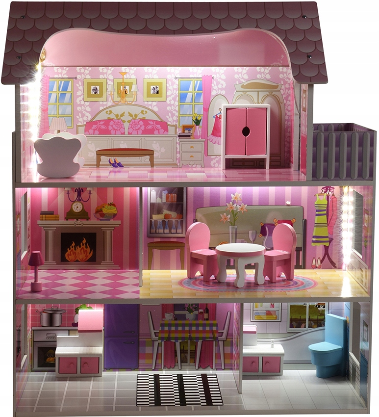 ВЕЛИКИЙ РОЖЕВИЙ ЛЯЛЬКОВИЙ БУДИНОК + МЕБЛІ + СВІТЛОДІОДНЕ ОСВІТЛЕННЯ