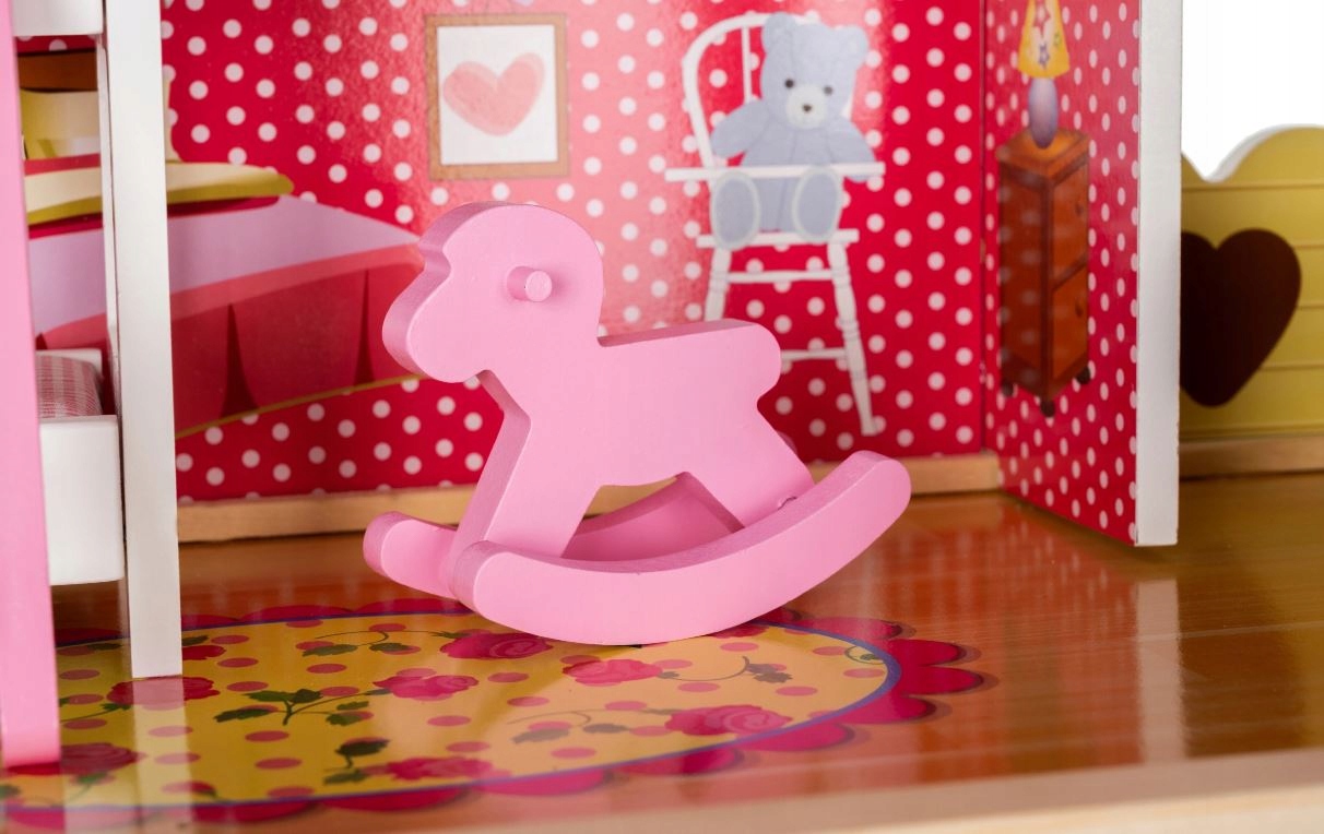 - СПЕЦИФІКАЦІЯ – матеріал: дерево; кількість елементів в наборі: 15 + будинок; розміри (довжина/ширина/висота): 29/59/90см; кількість рівнів: 3; кількість кімнат: 5 + балкон