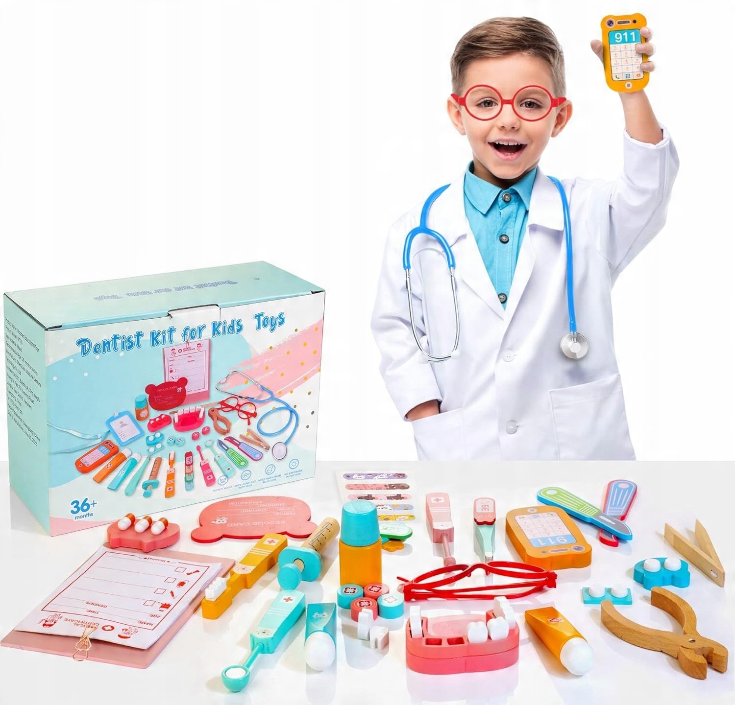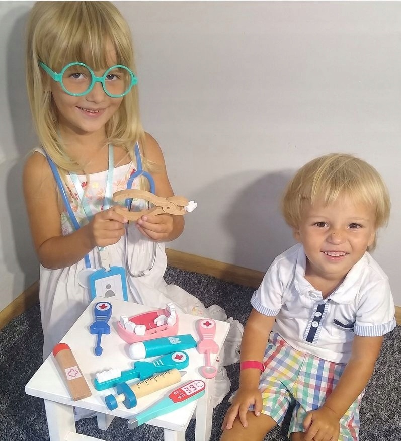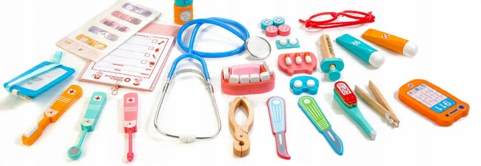 Дерев'яні інструменти для маленького стоматолога. Цей набір містить усе, що потрібно вашому маленькому лікарю, щоб грати в стоматолога. Майбутні лікарі можуть робити уколи, виривати та перевіряти стан зубів своїх пацієнтів. Гра в стоматолога - це не лише одна з рольових ігор, це такожнавчання догляду за гігієною та наслідки її відсутності. Це також вчить емпатії та співчуття, що дуже важливо в соціальних стосунках. Сприяє розвитку уяви та навчає вирішувати проблеми. Така розвага — чудова тренування перед відвідуванням справжнього офісу.