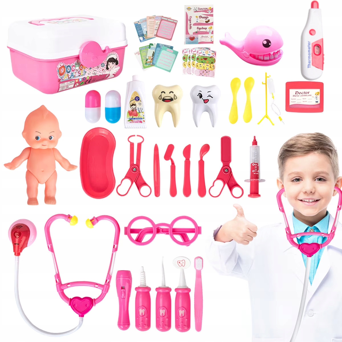 Граючи з набором для маленького лікаря, дитина дізнається про обладнання та інструменти, які використовуються в медичних або стоматологічних кабінетах. Під час гри з братами і сестрами, друзями чи батьками він проводить медичні огляди. Ваша дитина пригостить своїх ведмедиків і талісманів. Така забава позитивно вплине на хід вашого візиту до справжнього лікаря. Набір допоможе вам подолати страх перед візитом до лікаря чи стоматолога, зробить його менш стресовим. Це також дозволить вам пізнати людський організм.