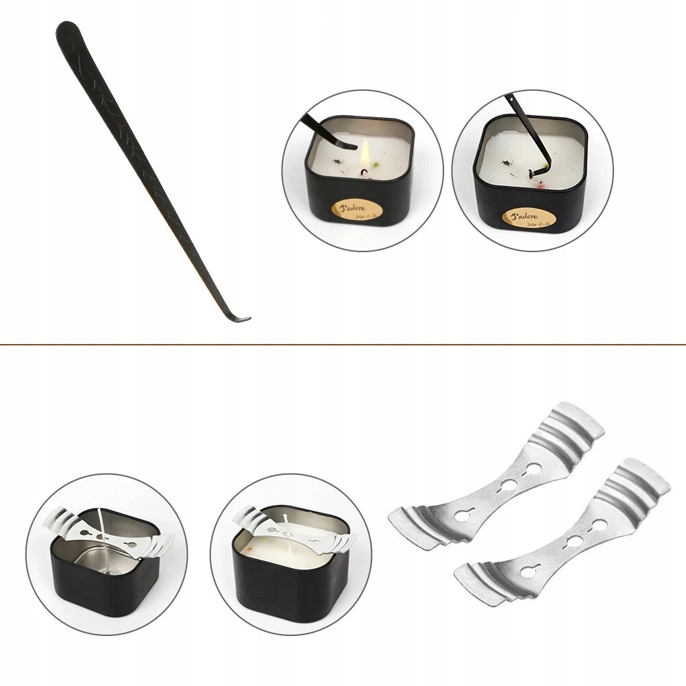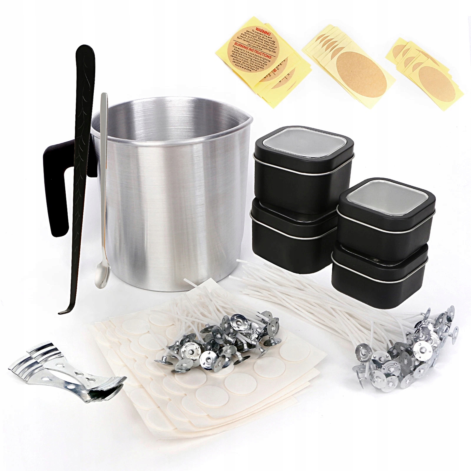 🕯️【Повний стартовий набір】 Набір включає 1 контейнер для воску на 1200 мл, 1 сталеву ложку для змішування з довгою ручкою, 100 ґнотів (два розміри по 50 штук), 4 банки для свічок, 4 наклейки, 2 тримачі та 1 вогнегасний інструмент.