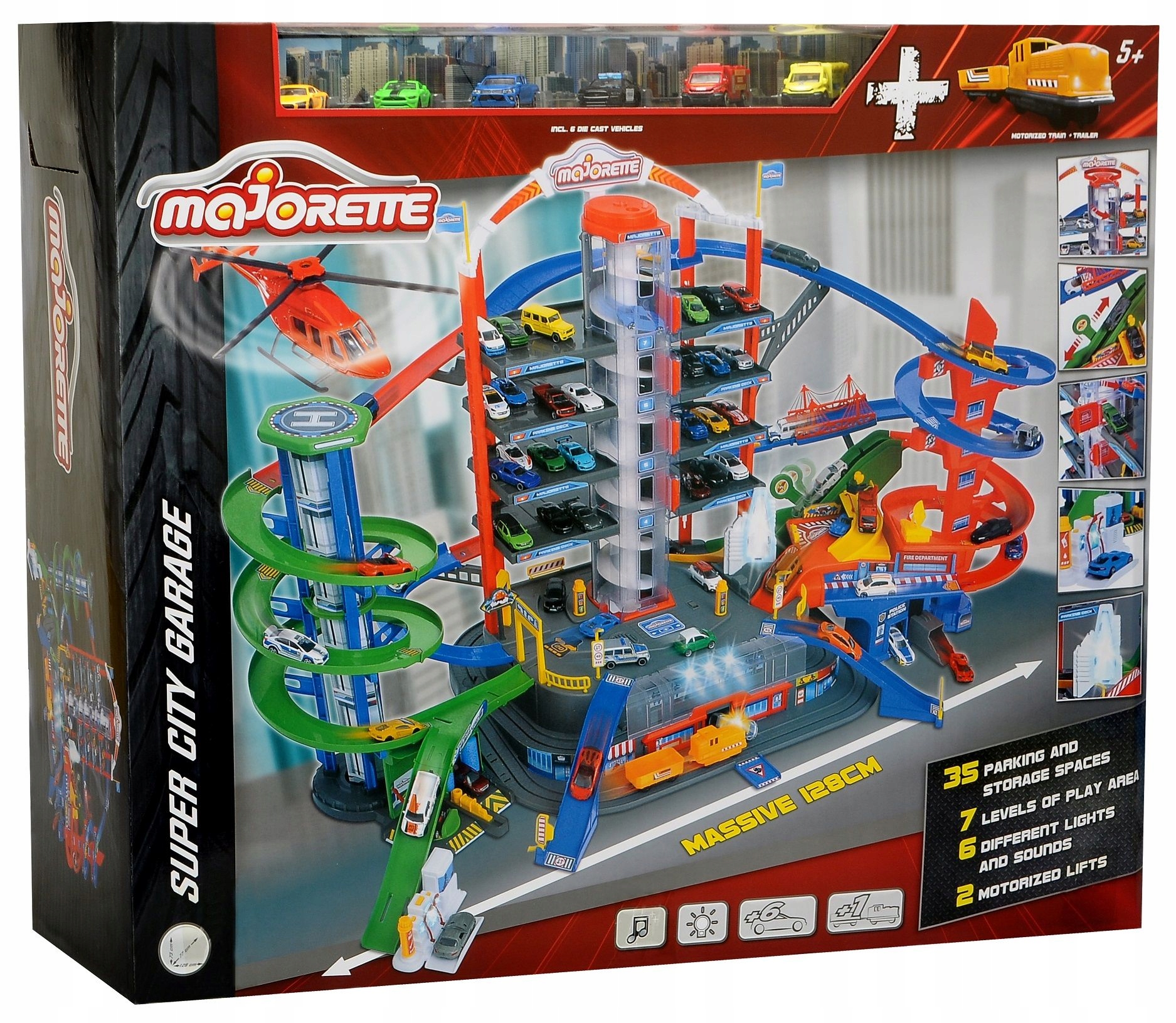 Super City Garage був створений широко відомою та шанованою компанією Majorette . Цей фантастичний набір включає 7-рівневий гараж, 26 автомобілів і локомотив із вагоном.