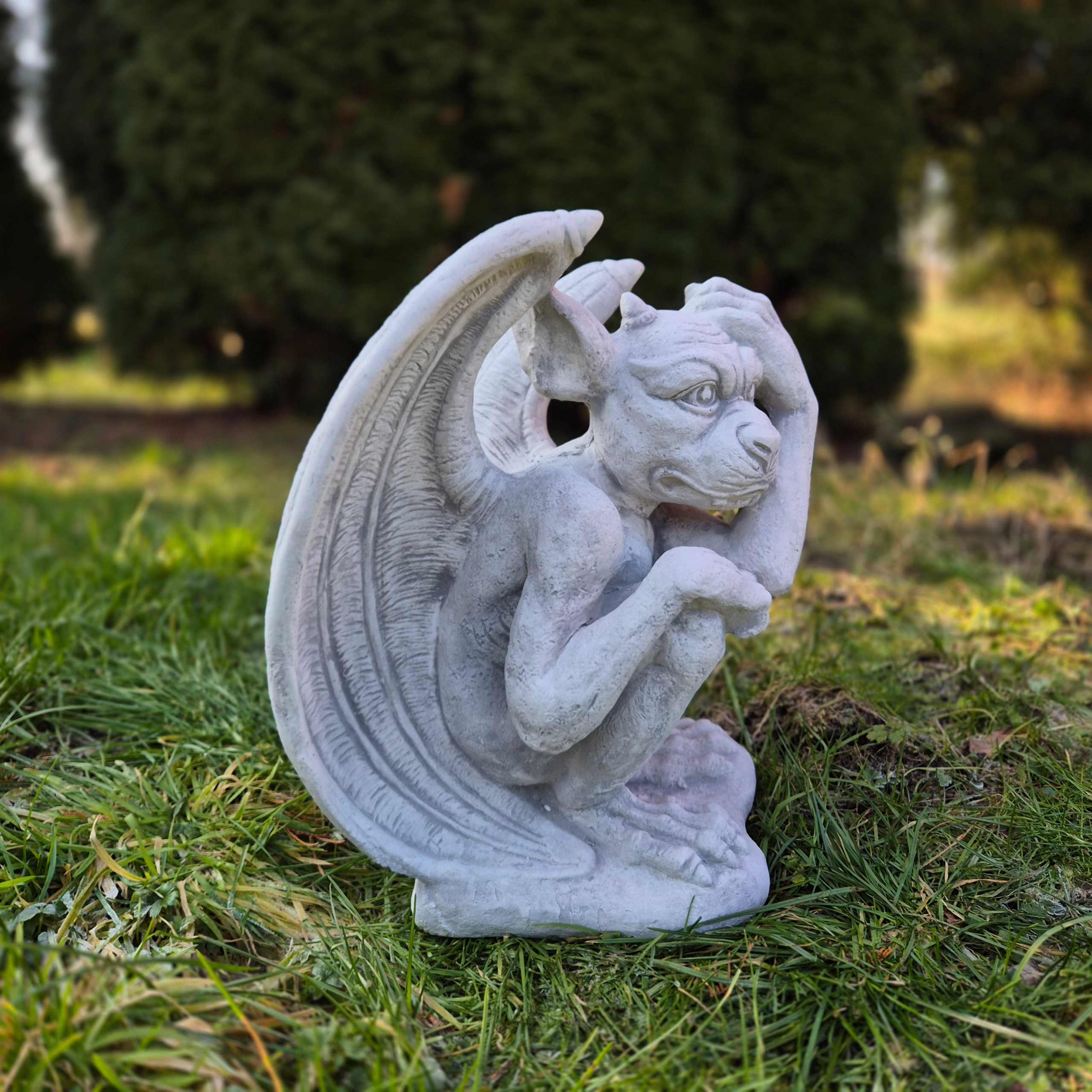 Велика горгулья висотою 43 см — це вражаюча і масивна прикраса саду, яка приваблює погляд своїм виразним силуетом і детальною обробкою. Стабільна конструкція та велика вага забезпечують стійкість до погодних умов та надійне розміщення в будь-якому місці.