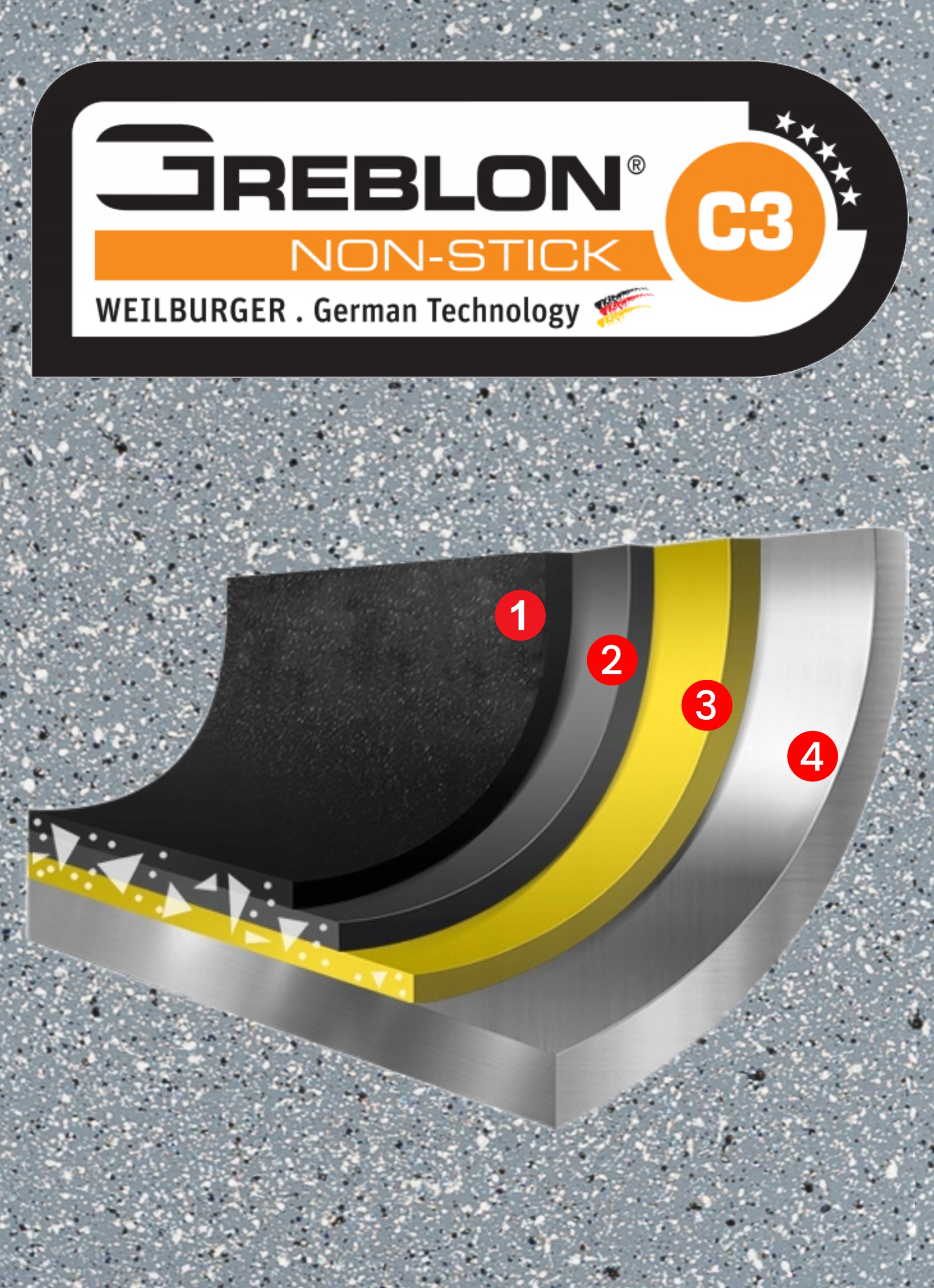 Каструля покрита покриттям антипригарного Greblon C3 . Це тришарове покриття підсилена кераміка , що гарантує нам довговічність наших суден.