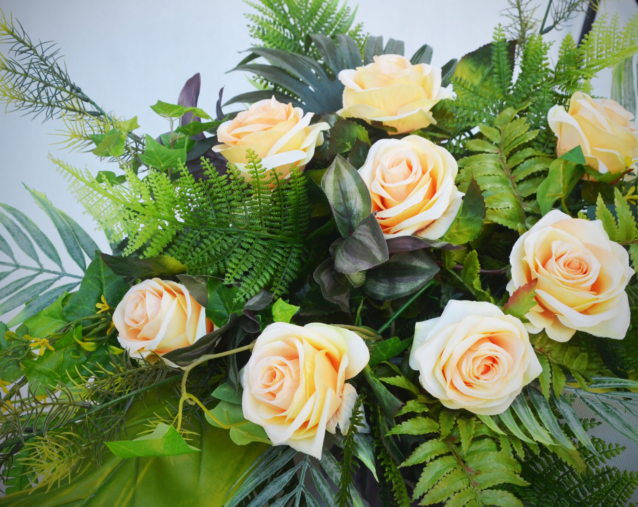 - 7 троянд чайного кольору, які виглядають як живі дуже багате оздоблення із зелених аксесуарів: листя, виноградні лози, папороті, плющ, спаржа та інші,