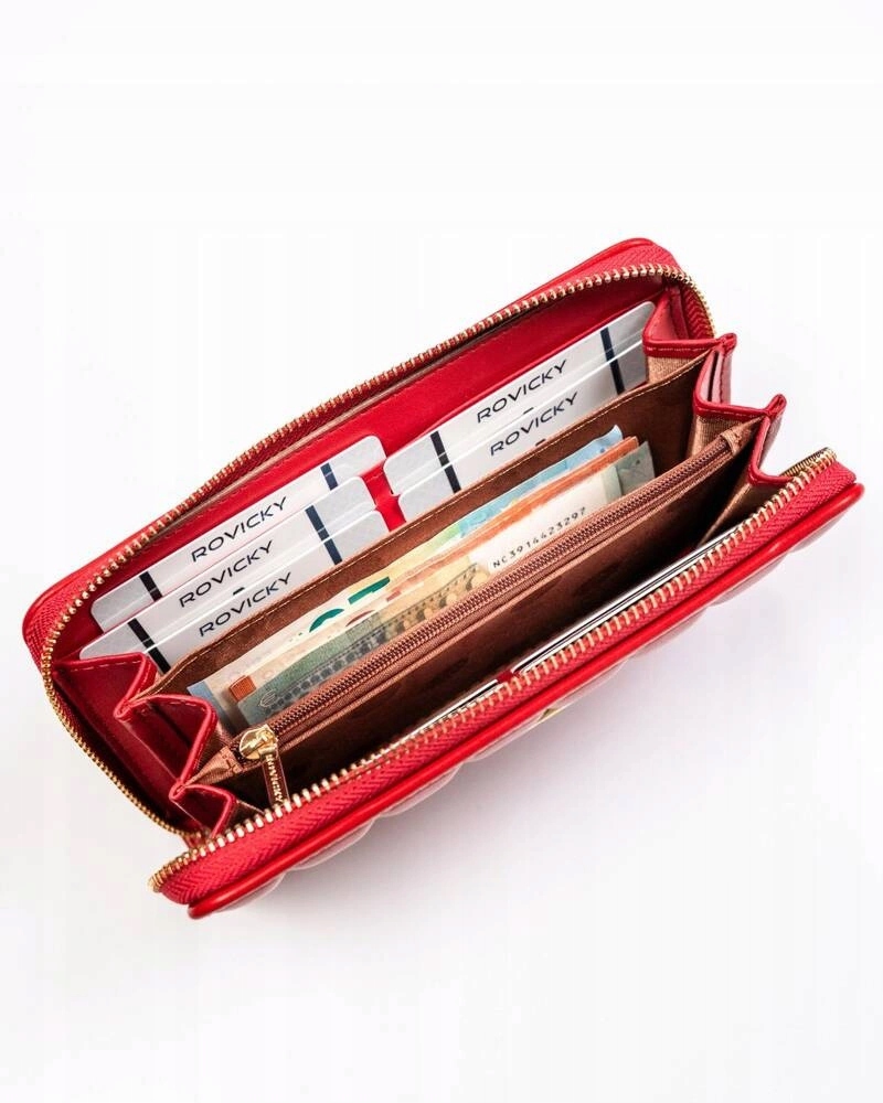 Жіночий гаманець Rovicky - це складний аксесуар, призначений для жінок, які цінують витонченість та функціональність. Зроблений з міцної, стьобаної екологічної шкіри в горизонтальній орієнтації, вона вражає великим розміром і позачасовим зовнішнім виглядом. Золоті фурнітура та логотип видимого виробника підкреслюють його ексклюзивний характер, що робить його ідеальним доповненням для всіх випадків. , банкноти та інші дрібниці. Він має до 10 відділень для платіжних карток, так що все важливо завжди під рукою. Додаткова закрита кишеня була призначена для монет, забезпечуючи їх безпечне зберігання. Практичні розміри дозволяють зручно зберігати реєстраційний сертифікат та інші основні документи. У той же час захищає його від випадкового розширення. Він доставляється в оригінальній елегантній коробці, що робить його чудовою ідеєю подарунка для коханої людини.