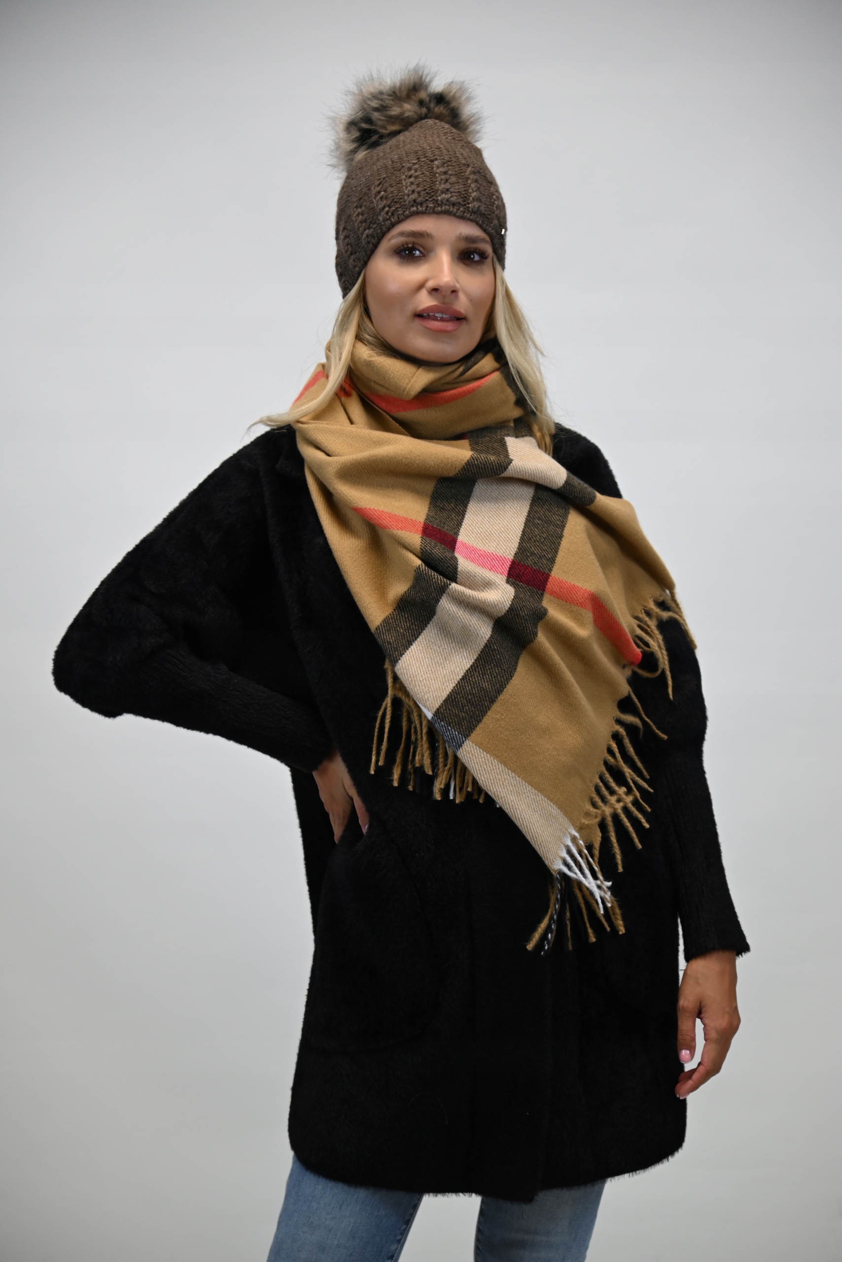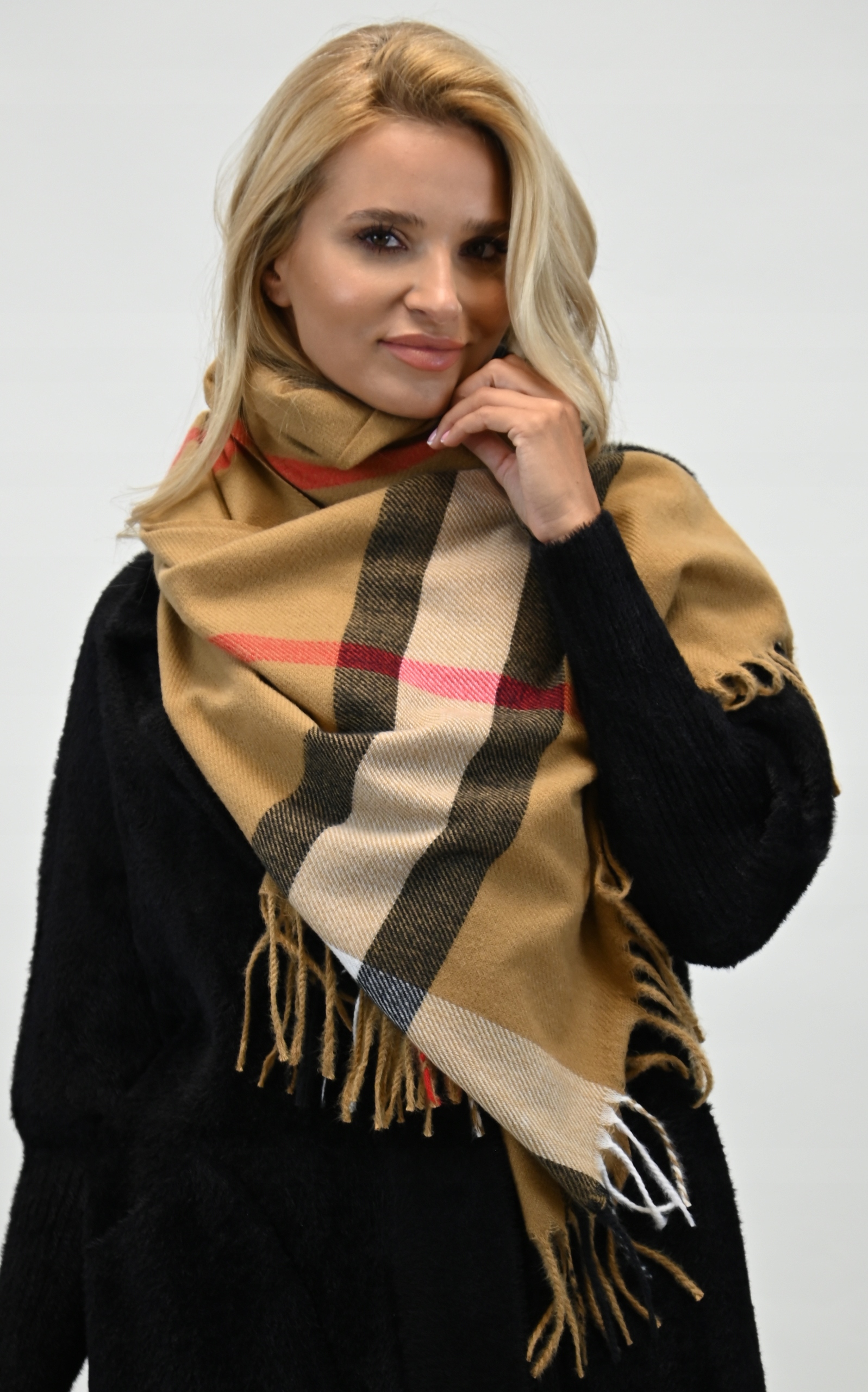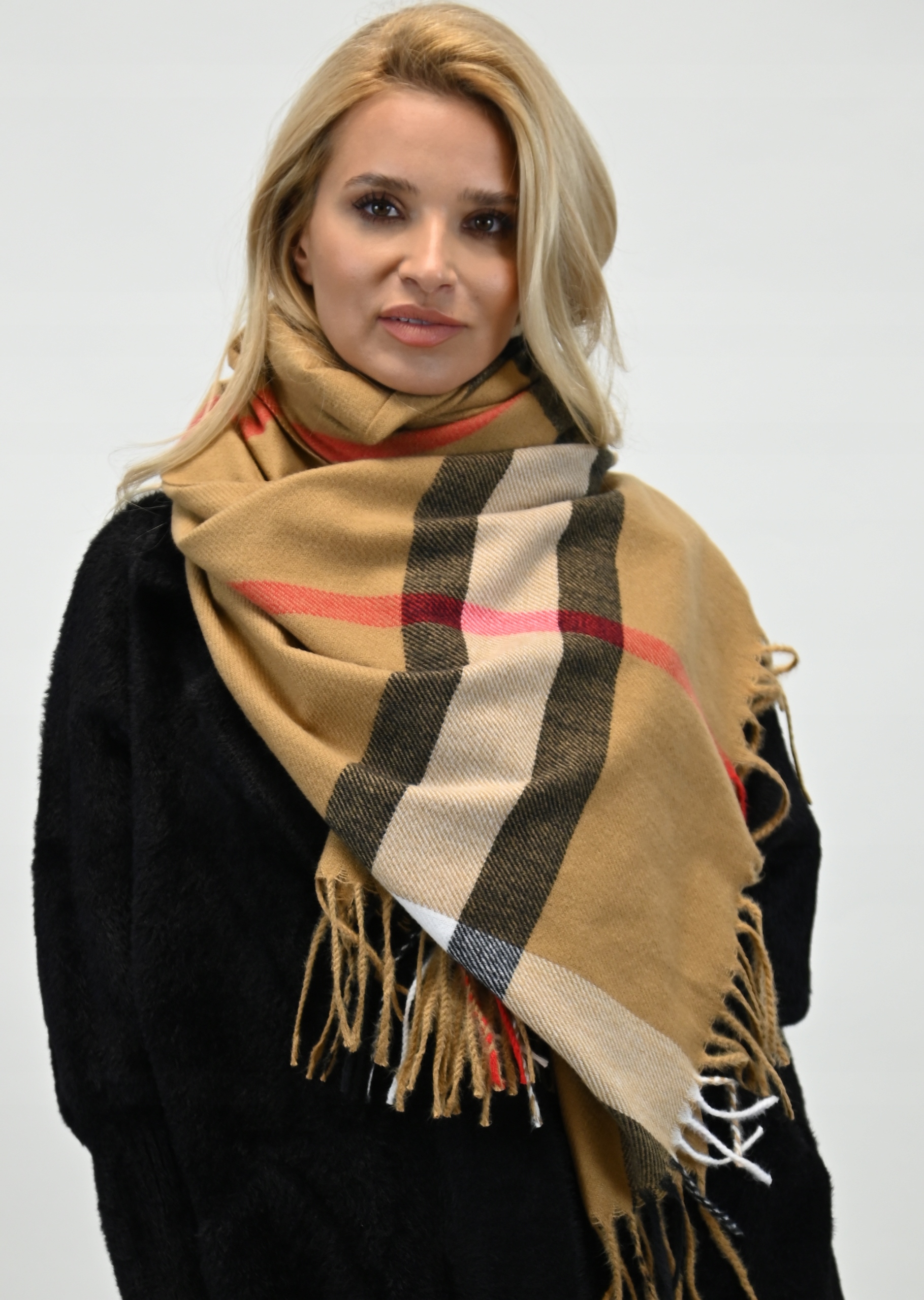 Стильно підібрані аксесуари дозволяють створювати оригінальні стилі та підкреслювати індивідуальність, тому в цьому сезоні вибирайте елегантний шарф англійська клітка, впізнаваний у всьому світі. Каретчастий шарф - це аксесуар, який ніколи не вийде з моди, він підходить всім жінкам незалежно від віку та стилю одягу, так як поєднується практично з будь-яким одягом. Шарф виготовлений з м'якого і дуже приємного на дотик матеріалу, оброблений бахромою.