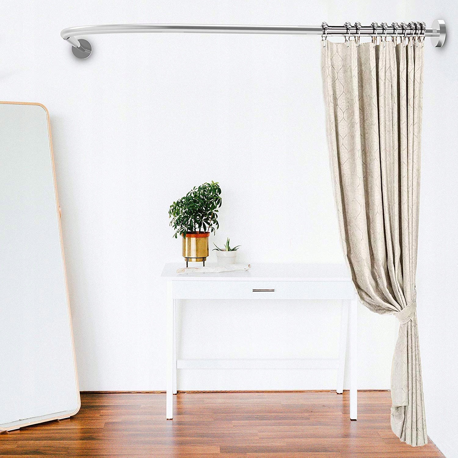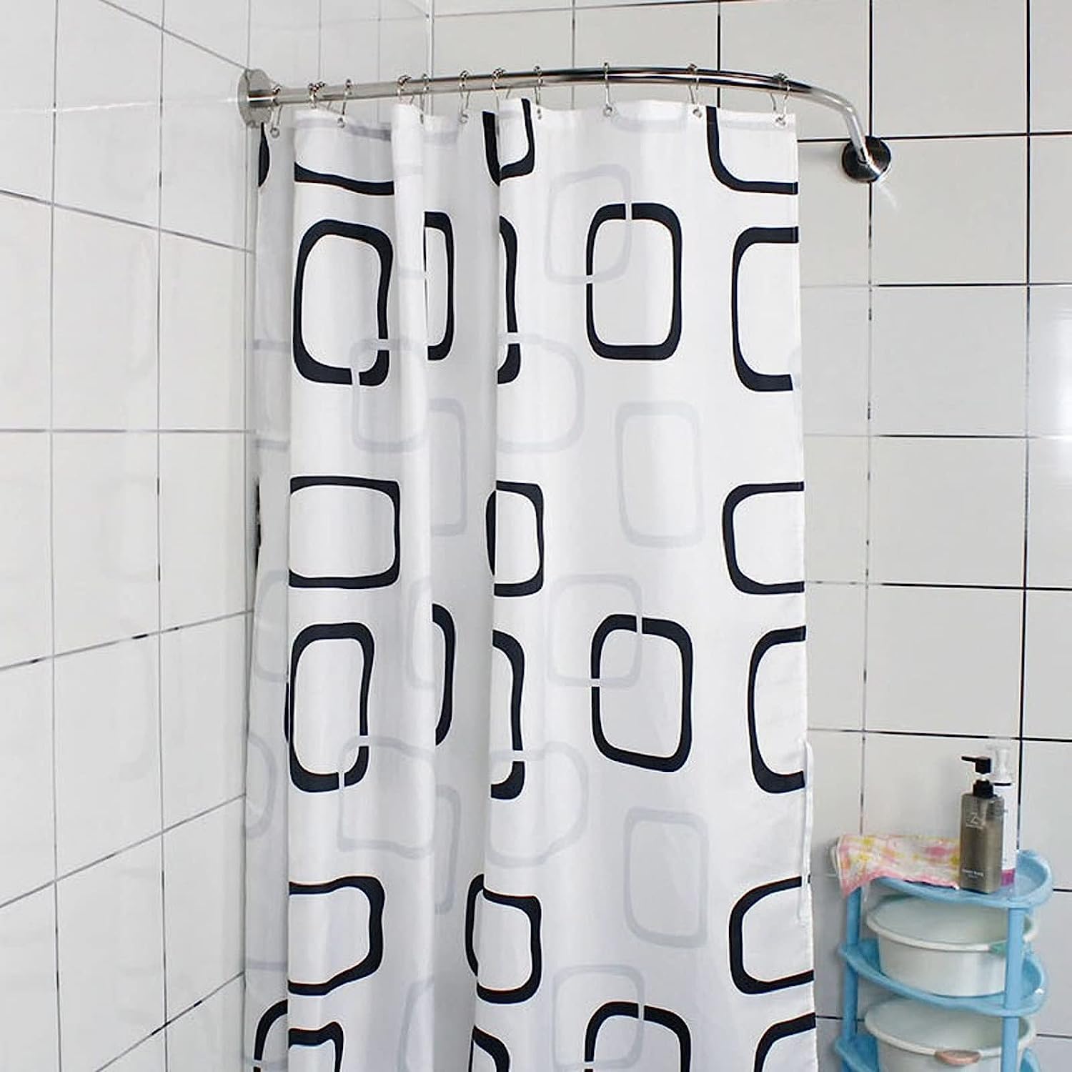 У L-подібній вигнутій конструкції використовуються штори, щоб розділити необхідний простір і забезпечити більше місця в душі, що ідеально підходить для кутових кімнат. Діаметр кутової душової штанги 2,5 см. Примітка. Душова штанга не включає душову шторку.