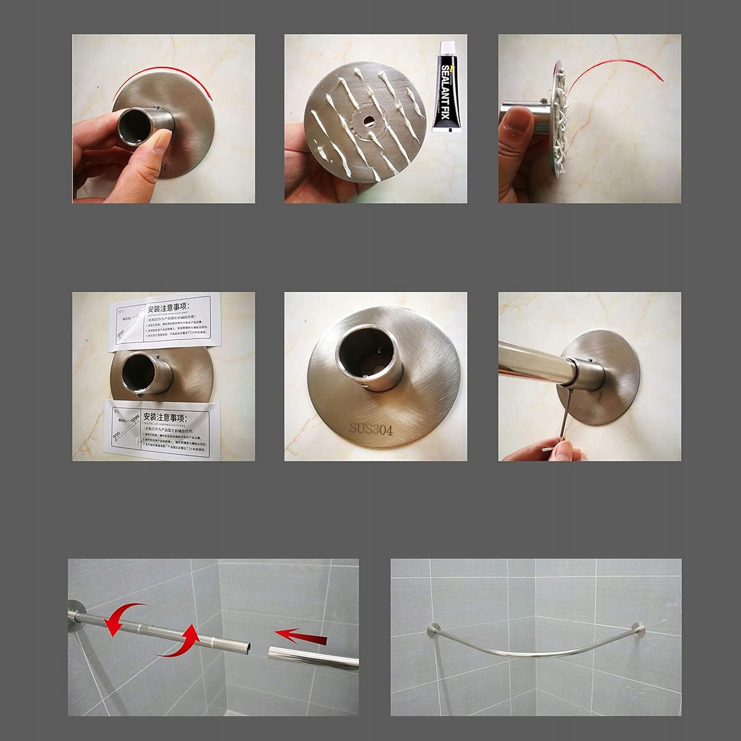 Включає кріплення з нержавіючої сталі, гвинти, настінні та монтажні кронштейни. Є 2 методи встановлення: 1. свердлити отвір, 2. без свердління. Цей тип свердління простий на будь-якій гладкій поверхні, наприклад на стінах з керамічної плитки. Встановлення займає лише 20-30 хвилин для однієї людини.