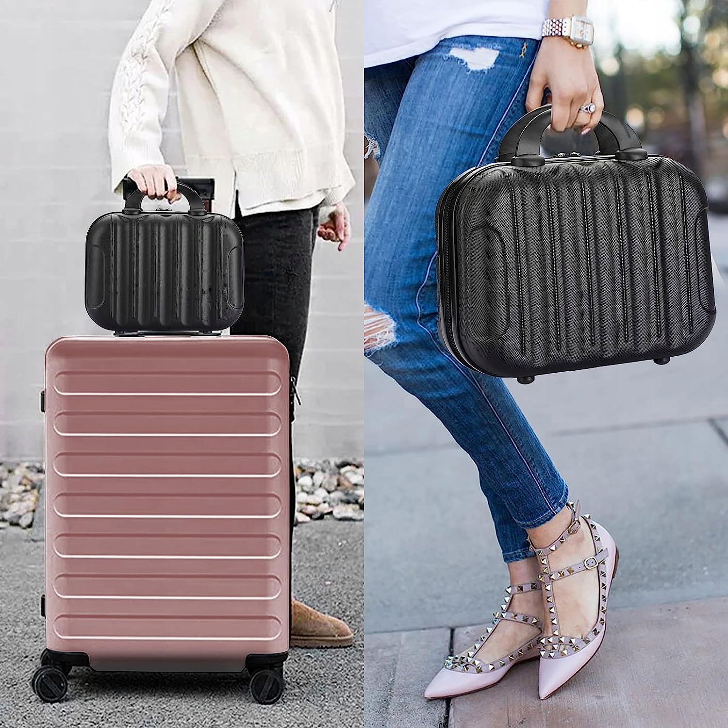 Косметичка має дві ручки з жорсткого матеріалу. пластик. Чохол також має еластичну стрічку з одного боку, яка використовується для кріплення, наприклад, до ручки валізи