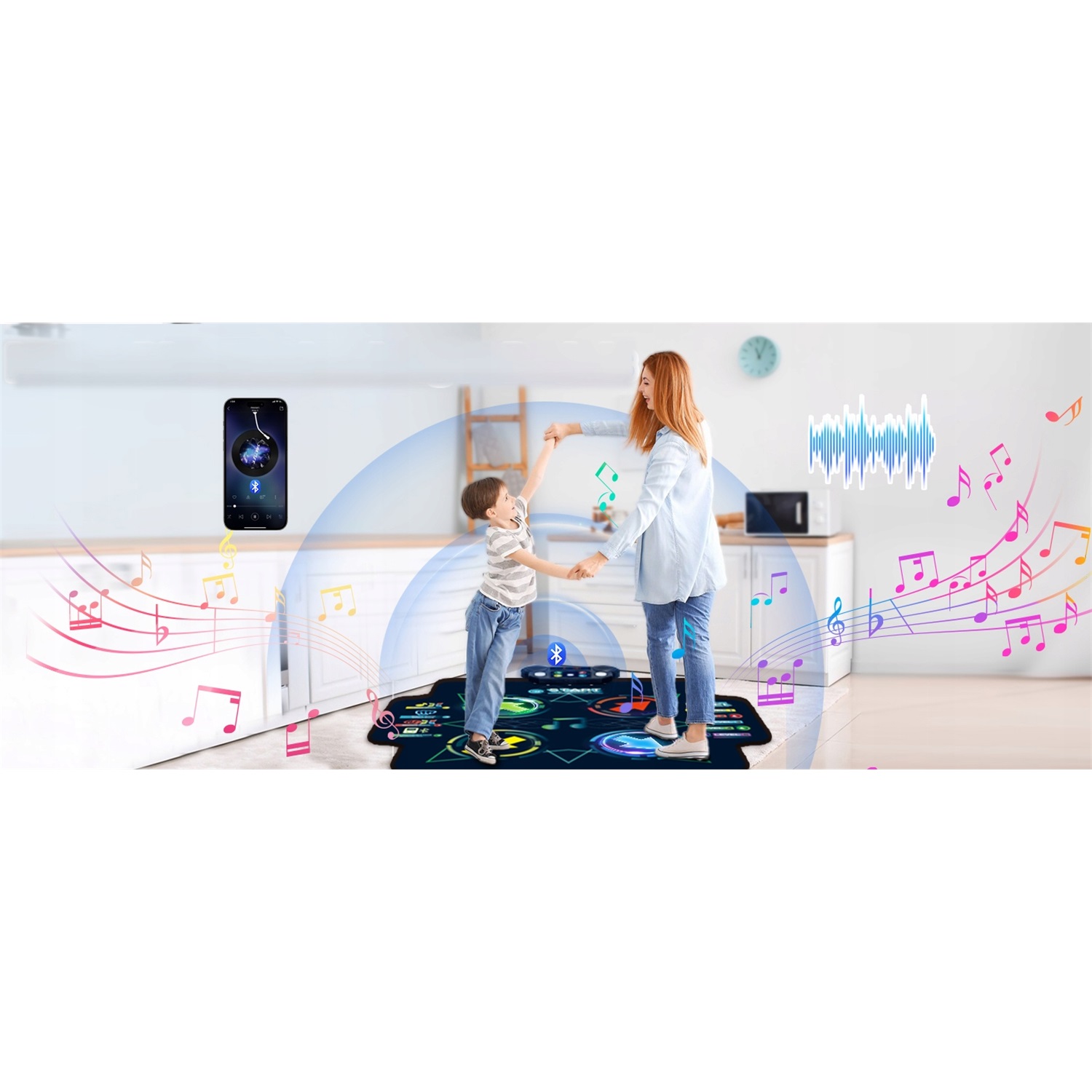 Цей дитячий танцювальний килимок має вбудований високоякісний модуль Bluetooth, який легко підключається до смартфонів, щоб миттєво перетворити музичну бібліотеку вашої дитини на інтерактивні танцювальні ігри! Без клопоту з кабелями та обмежень діти можуть вільно танцювати під улюблені дитячі та поп-пісні будь-де та будь-коли. Динаміки високої роздільної здатності видають чистий, ритмічний звук, створюючи захоплюючу танцювальну атмосферу, яка значно збільшує задоволення від вечірки. Завдяки цьому діти можуть вивільняти свою енергію з музикою, одночасно розвиваючи глибокий інтерес до музики.