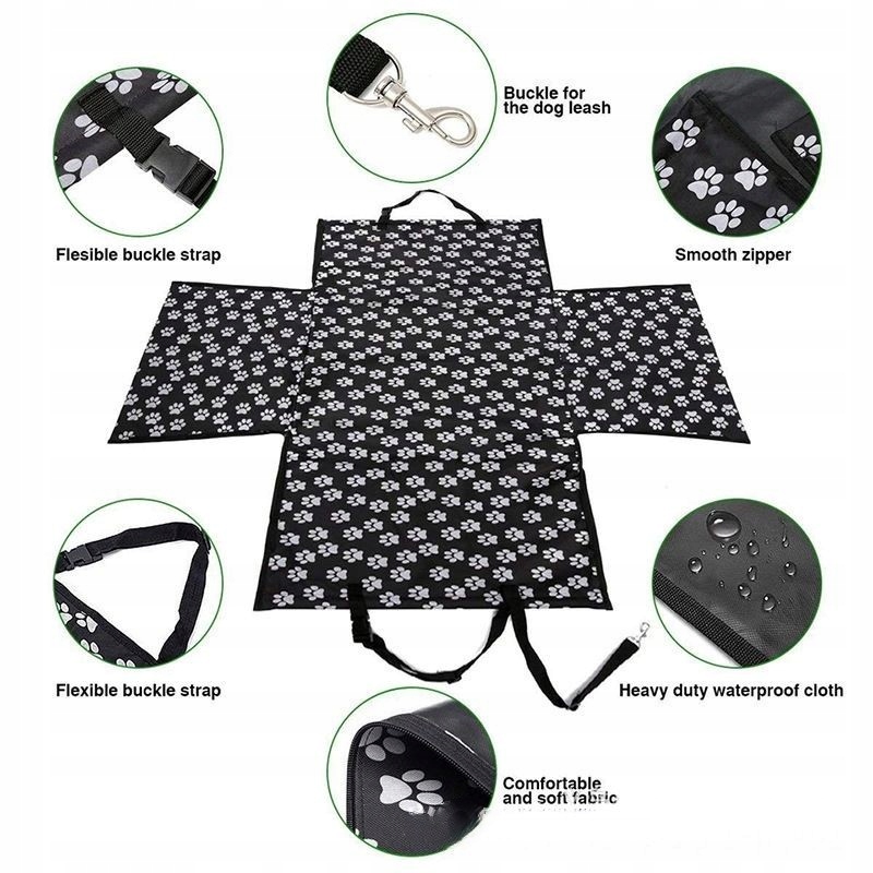 Малий килимок для автомобіля пропозиція для всіх любителів домашніх тварин і... чистого автомобіля. Автомобільний килимок з чарівним малюнком білих відбитків лапок на чорному фоні ідеально підійде для подорожей з вашим вихованцем. Килимок оснащений блискавками, які дозволяють «закрити» його з боків і перетворити в безпечний манеж. Завдяки цьому ви можете бути впевнені, що ваш вихованець не вискочить на вулицю, коли ви відкриєте двері. Манеж займає приблизно половину заднього сидіння, тому місця ще достатньо для ще одного пасажира. Ви також можете перевозити двох тварин в окремих загонах.