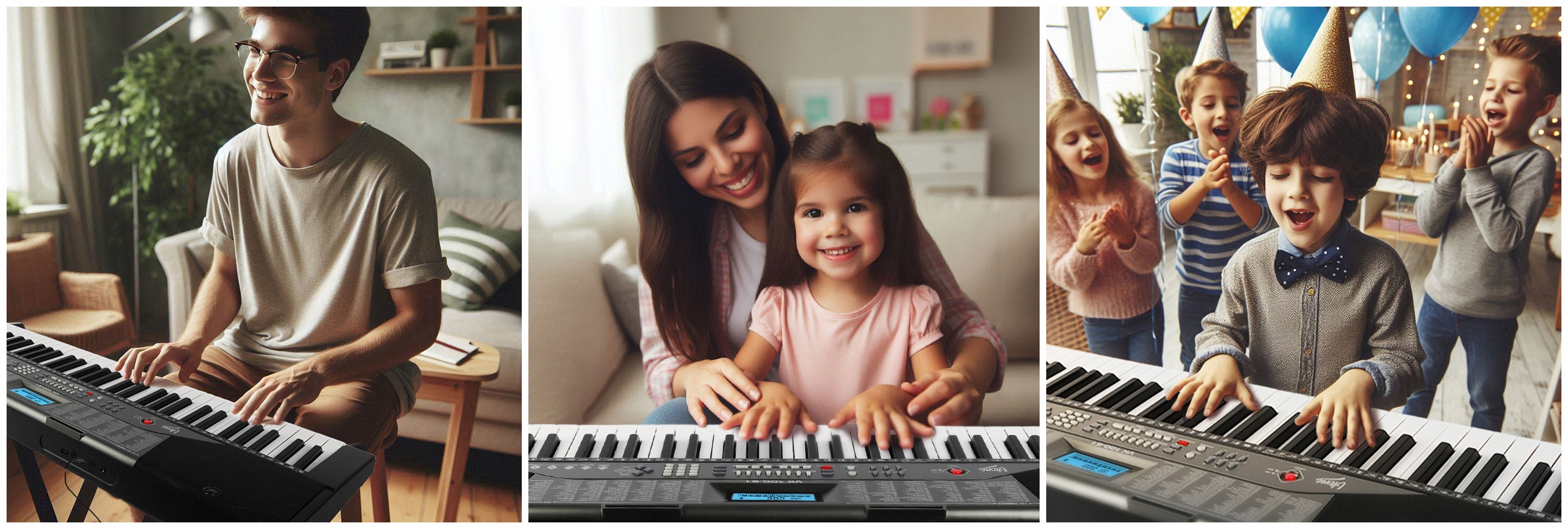 Для початку ✅ однозначно клавіатура! По-перше: це дешевшепіаніно, в тому числі й цифрове, а по-друге: пам'ятайте, що окрім навчання діти понад усе люблять розваги. Завдяки V-TONE VK 100-61 вони можуть відкрити для себе світ інструментів, звуків і музичних стилів. Клавіатурамає банк з 255 інструментів і стільки ж ритмічного акомпанементу. Це дозволяє вивчати різні звуки, тембри та ритми, які найчастіше зустрічаються в музиці. Крім того, користувач може контролювати гучність клавіш, а також темп і гучність акомпанементу.