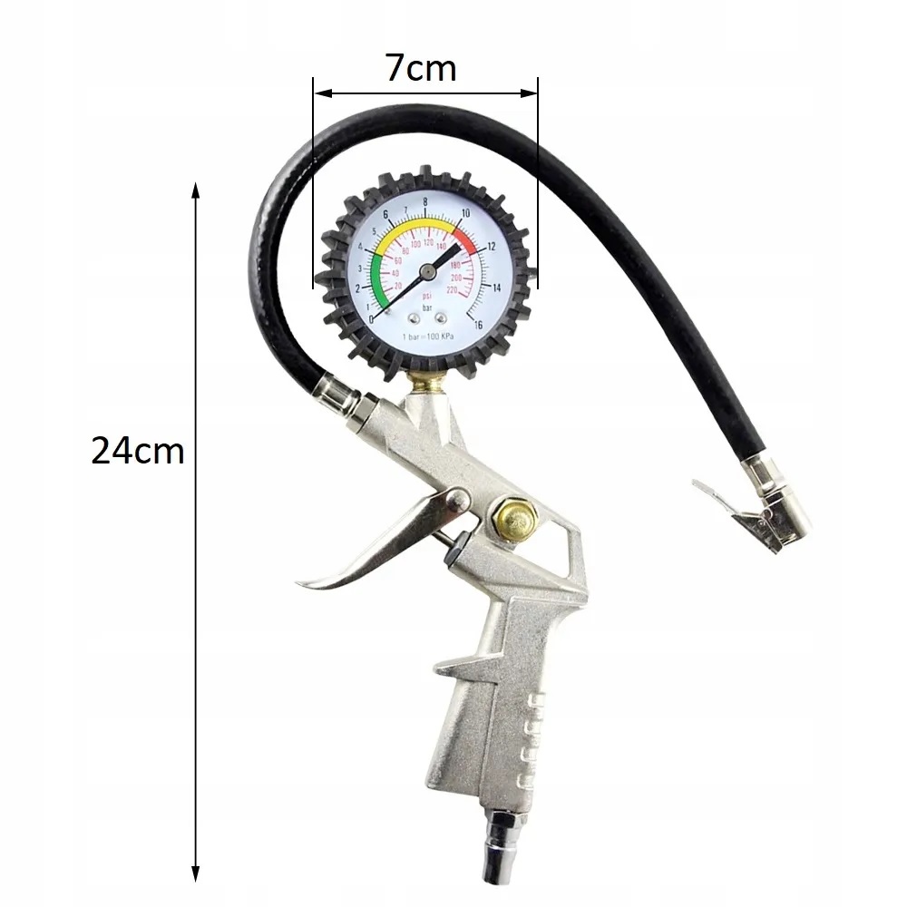 пістолет характеризується високою якістю. Оснащений точним манометром тиском з лусочками, собакою, укладеною гумою, що захищає його від пошкоджень. Вся структура міцна і стійка до пошкодження. Діапазон великого пальця - це спеціальний клапан, який дозволяє легко регулювати кількість повітря в шині. Ідеально підходить для будь -якого семінару, він також рекомендується для вулканізаційних заводів