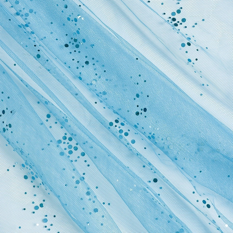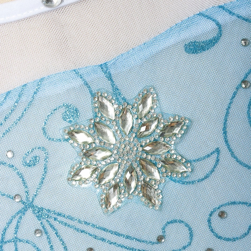 Надзвичайно ефектно завдяки красивій вишивці корсета кристалами, які створюють сніжну діамантову зірку. Тюль в поєднанні з цікавим блискучим матеріалом. Додатково срібляста обробка. Все на красивому синьому атласі в атмосфері морозної королеви.