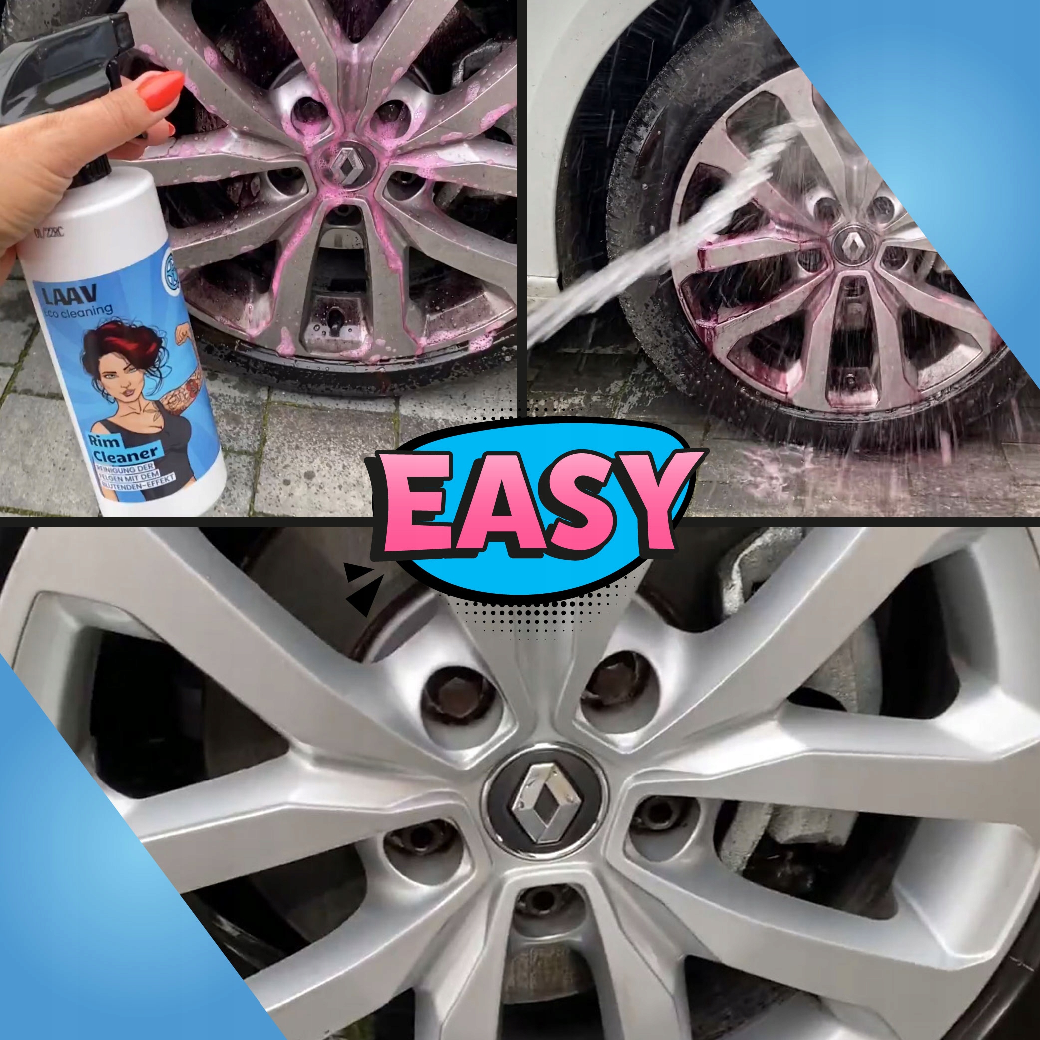 Наконечники, сплави чи ковпаки, жоден із них не встоїть перед космічними технологіями LAAV RIM CLEANER, професійний засіб впорається з усіма металевими забрудненнями та поверне первісний блиск . В результаті виходить топовий тренд червоно-фіолетового кольору «кривавий обідок». Захід стосуватиметься очищення металевих елементів, коліс велосипедів і мотоциклів.