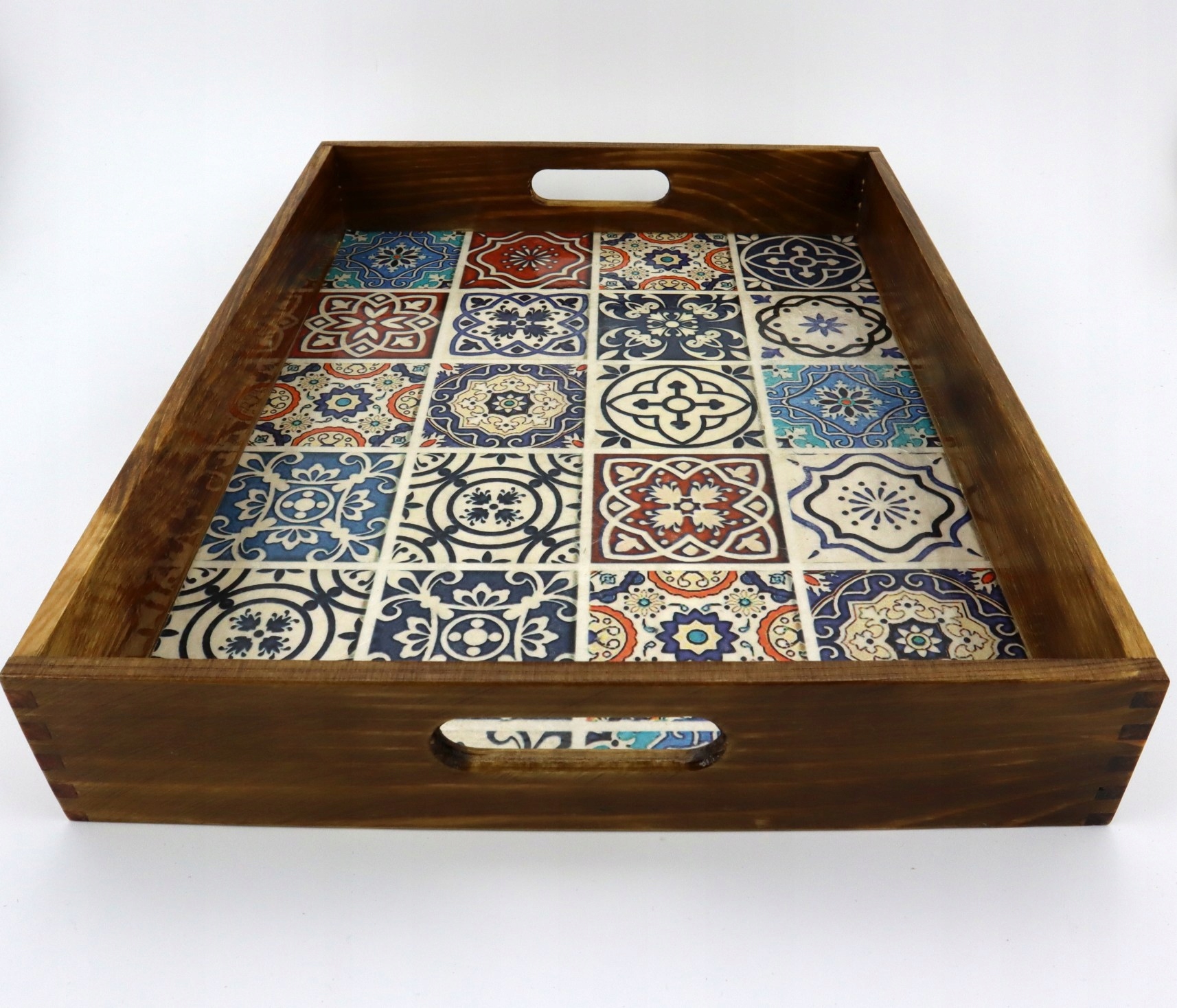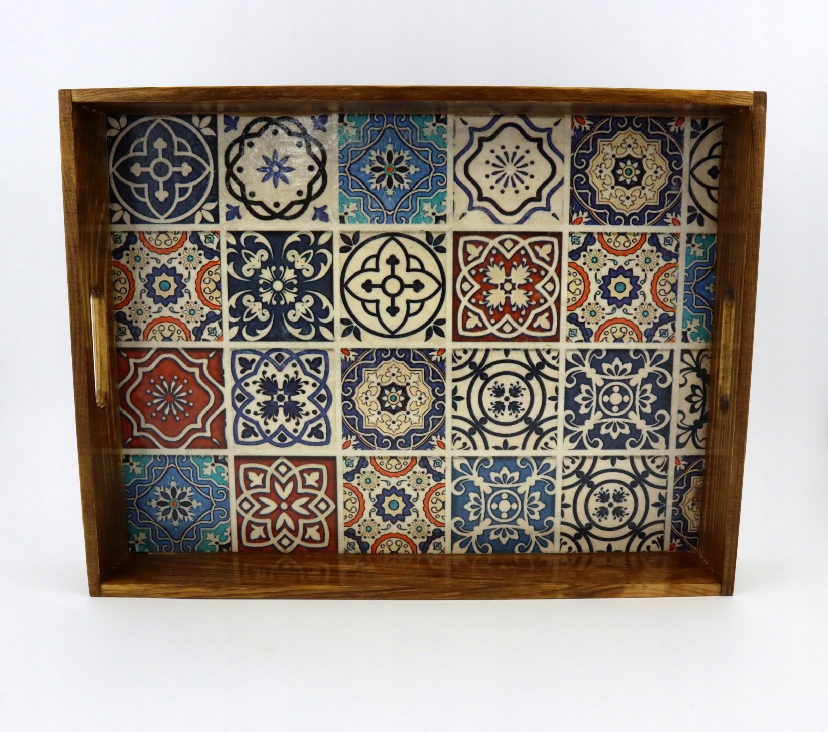 Піднос декорований методом декупажу, візерунком азулежуш. Ця традиційна техніка надає підносу унікального характеру та вносить у ваш простір нотку свіжості та оригінальності.