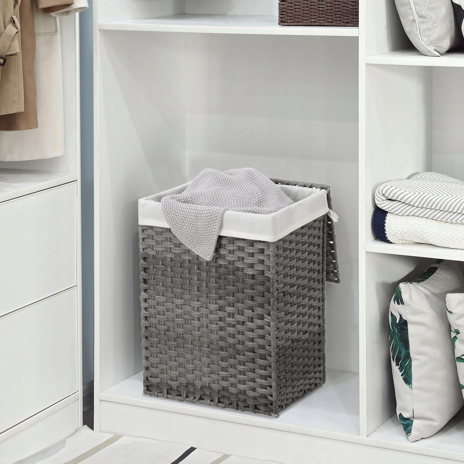 Кошик для білизни ручної роботи сірого кольору.
