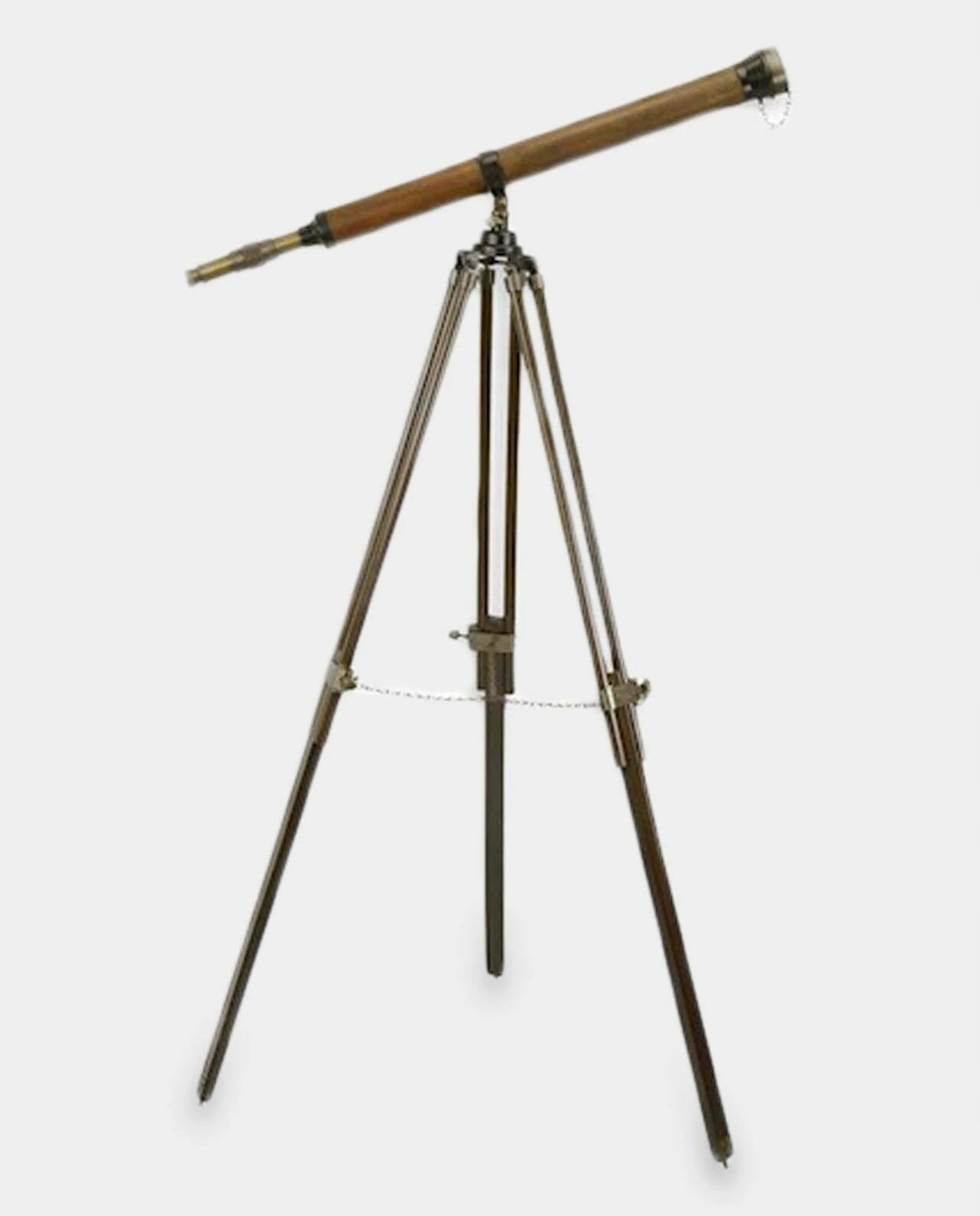 Великий декоративний телескоп на дерев'яному штативі. Виготовлений з латуні, основа з дерева та металеві елементи. Декоративний люнет - неординарна прикраса в стилі ретро. Це може бути прикрасою вітальні, домашнього офісу або елегантного кабінету. Такий експонат додасть будь-якому приміщенню наукової, вінтажної атмосфери. Пристрій такого типу відразу нагадує часи Кеплера чи Галілея. Завдяки цьому він може стати ідеальним подарунком для астронома, вченого та мандрівника.
