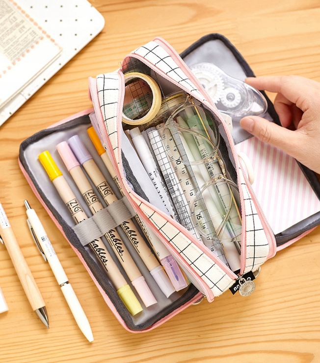 Цей пенал — простий варіант для студентів. Його широке основне відділення вміщує багато ручок. Зовні є два відділення: одне, куди учні можуть помістити ручки й олівці, використовуючи прорізи, а інше – куди вони можуть зберігати гумки, олівці та нотатки.