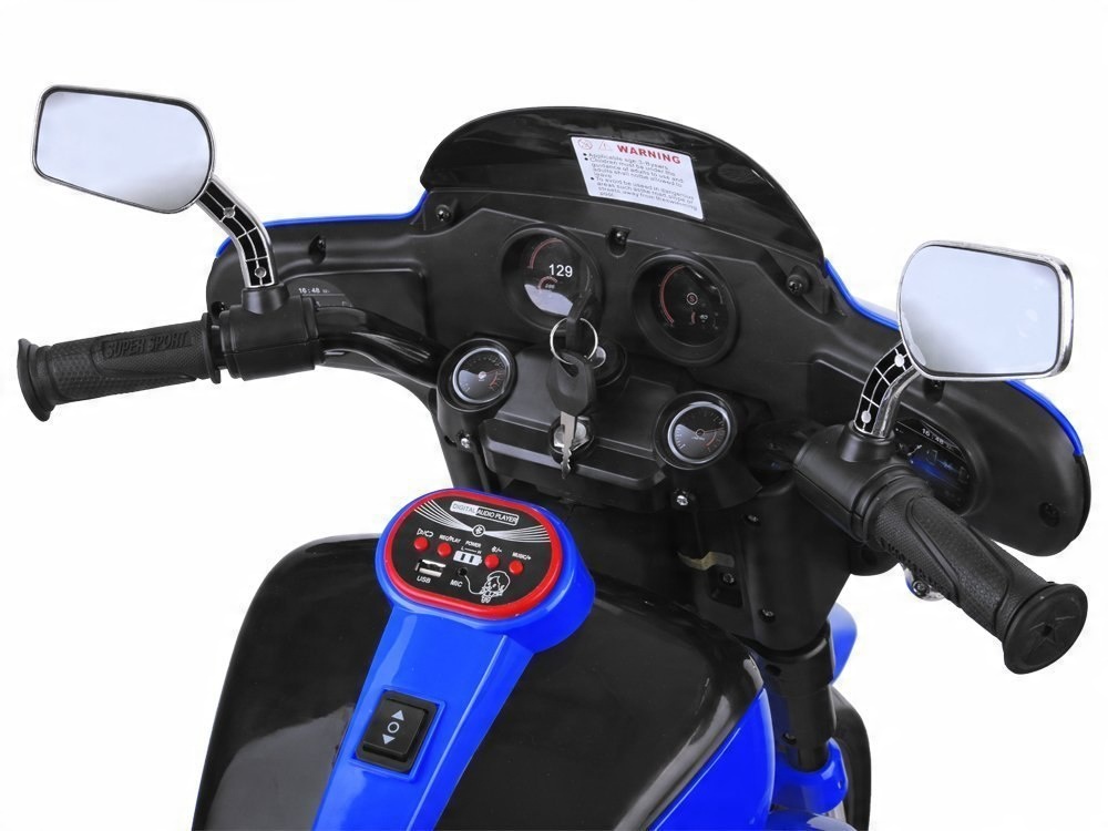 Ємність акумулятора контролюється панеллю з індикатором заряду акумулятора, тому ви можете легко спланувати прогулянку з дитиною на мотоциклі. Щоб зробити поїздку більш привабливою, транспортний засіб оснащений музичною панеллю, завдяки якій дитина може слухати веселу музику або підключити свою музичну апаратуру.