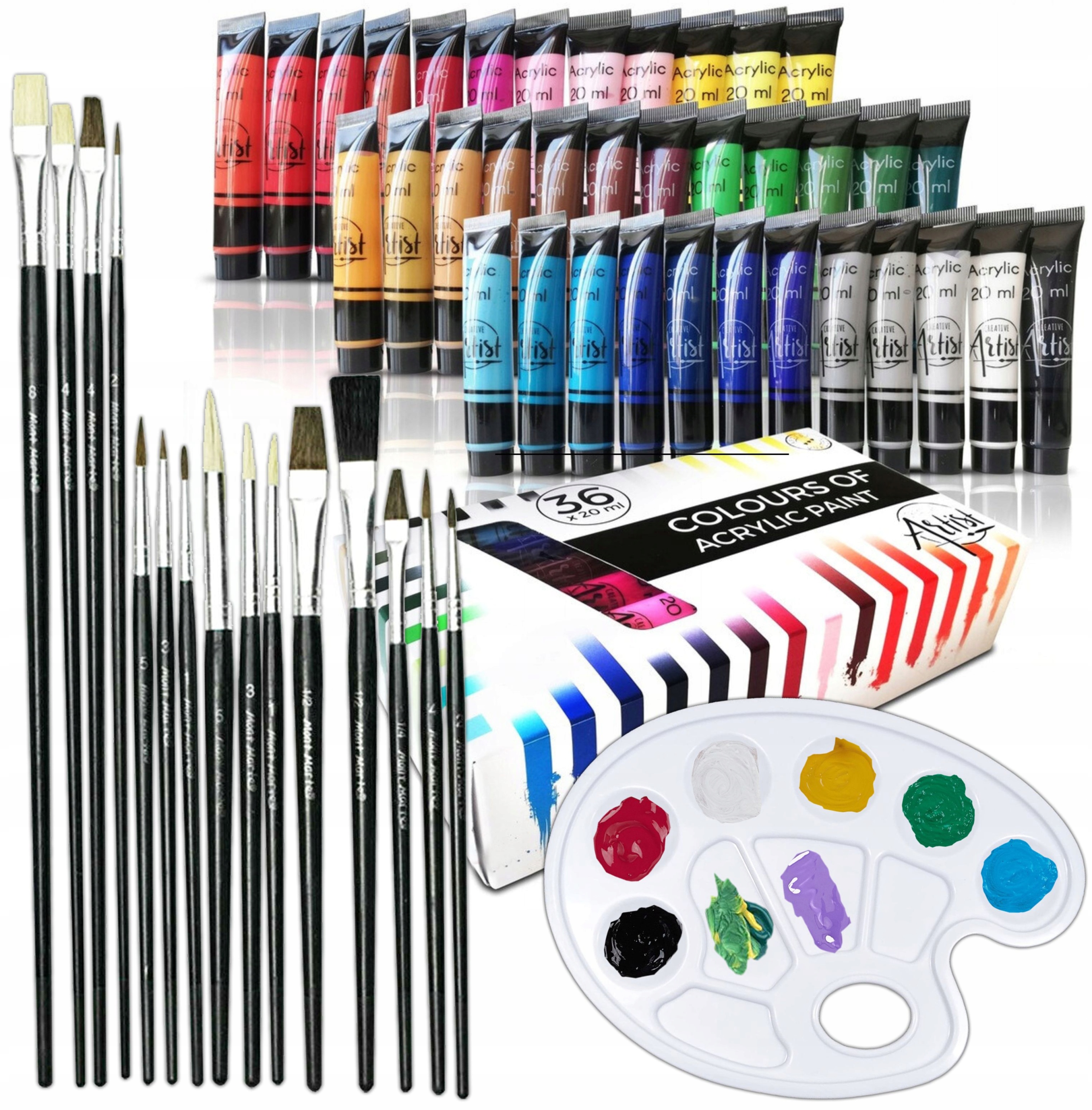 ВЕЛИКИЙ НАБІР ДЛЯ МАЛЮВАННЯ АКРИЛОВІ ФАРБИ 36x20 мл + ПЕНЗЛИКИ 15 ШТ + ПІДДОН