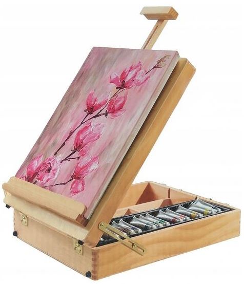 У набір входить не тільки сам мольберт, а й валіза, яка укомплектована такими елементами, як фарби, пензлики, олівці, а також живописні полотна з дерев'яною рамкою, палітрою або шпателем. Цей набір ідеально підходить для людей, які починають свою пригоду з малювання, або для людей, у яких мало місця для більшого мольберта. Варто також підкреслити, що це чудова ідея для організації фарб, пензлів та інших аксесуарів для малювання. Такий набір також чудово підійде як подарунок.