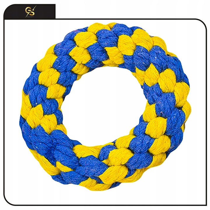плетене кільце в інтенсивних синьо-жовтих кольорах з діаметром 12 см-чудова іграшка для кусання та носіння. тверда згинання мотузки забезпечує міцність і в той же час масажує ясна під час кусання. Кільце легке і зручне захопити, завдяки якому собака охоче носить і апортує. Різноманітність текстури стимулює почуття собаки та забезпечує довгострокову забаву.