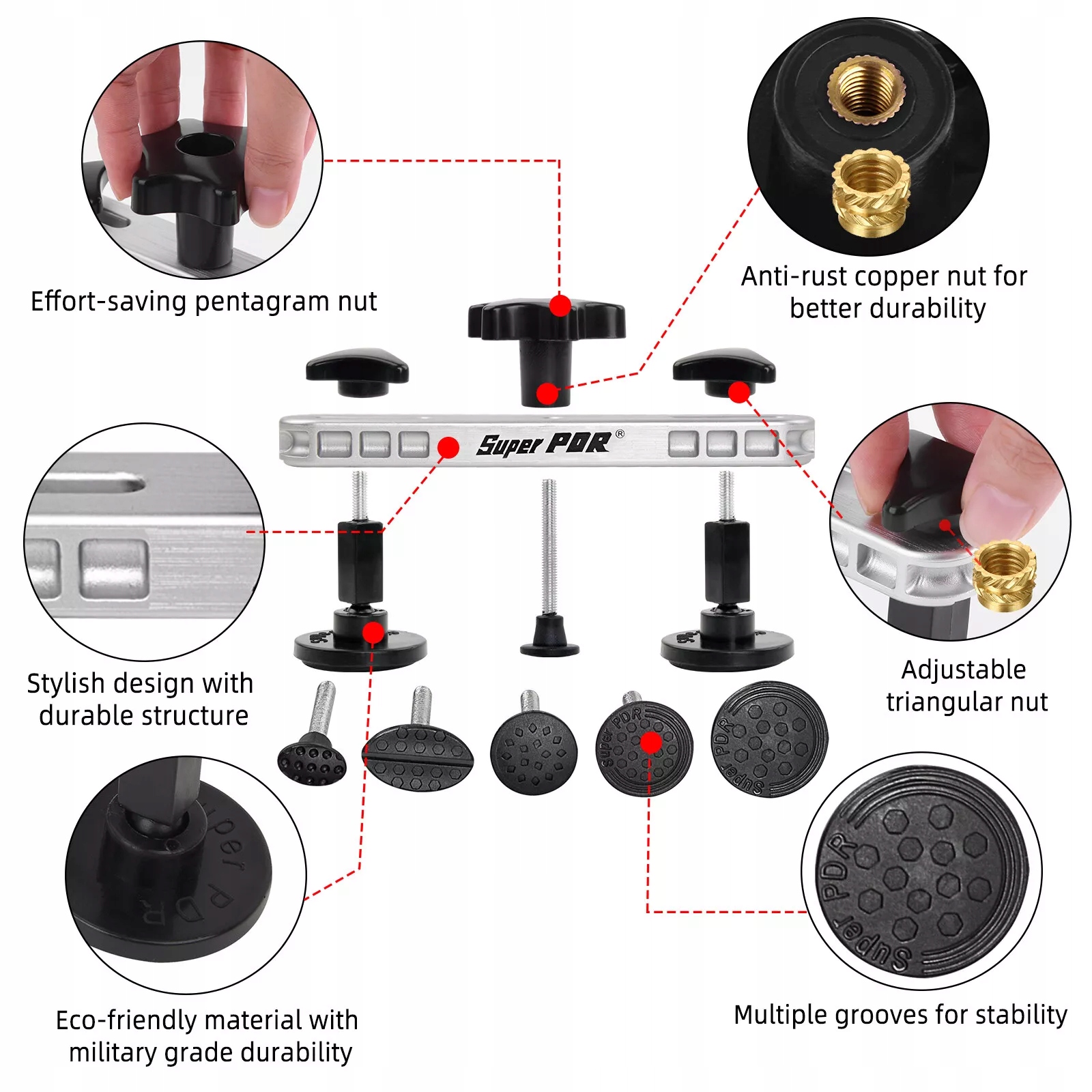 виготовлені з високоякісних матеріалів, міцних і стійких до корозій. Будь -хто може видалити вм'ятини, прості у використанні. Він може бути демонтований на двох різних T стрижнях, довгій T палиці для видалення вм'ятин та короткої T смуги для видалення вм'ятин, два інтелектуальні способи використання