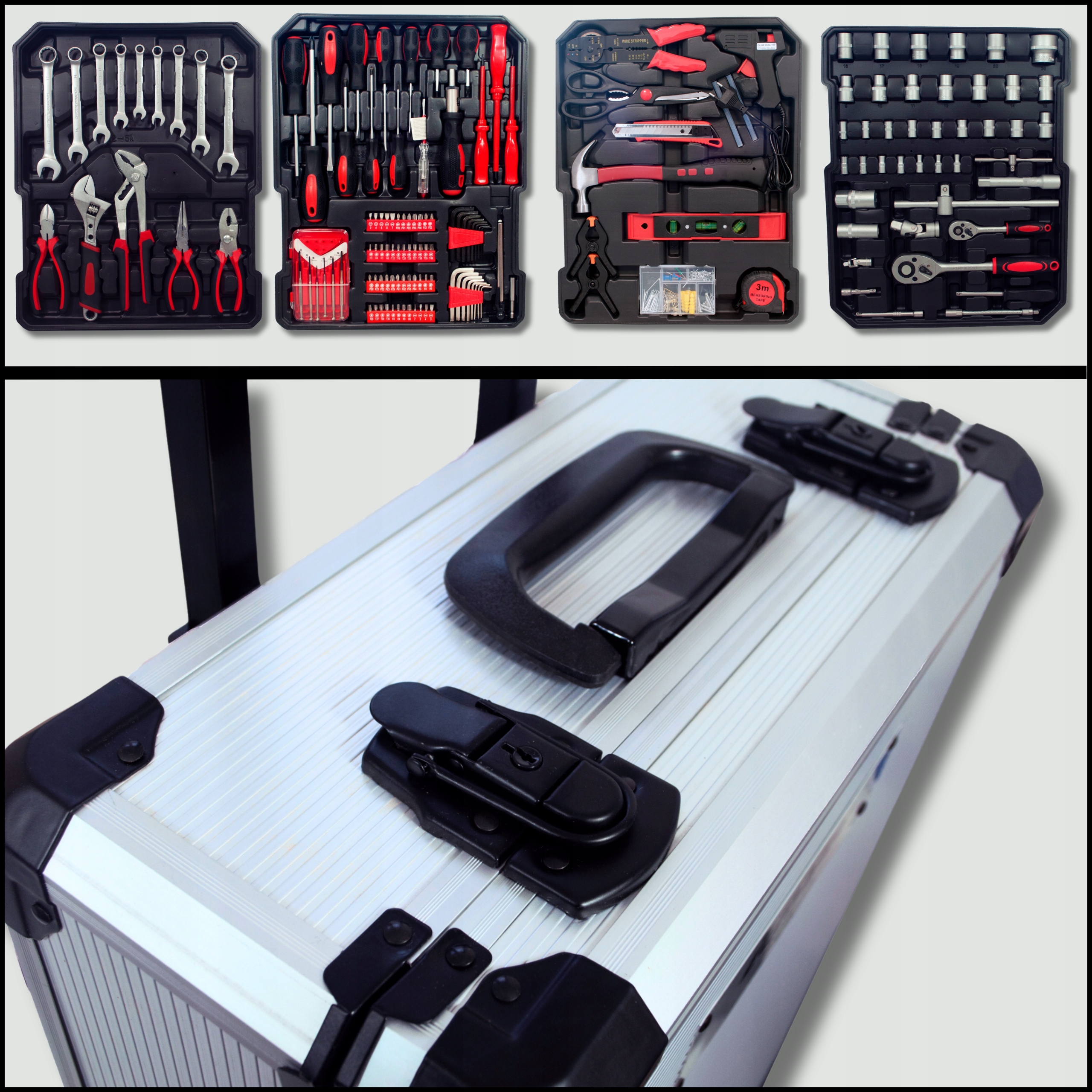 ✅ Усередині ви знайдете, серед іншого, гайкові ключі, плоскогубці, викрутки, шестигранні ключі, плоскогубці, молоток, рівень, торцеві наконечники та багато інших інструментів.