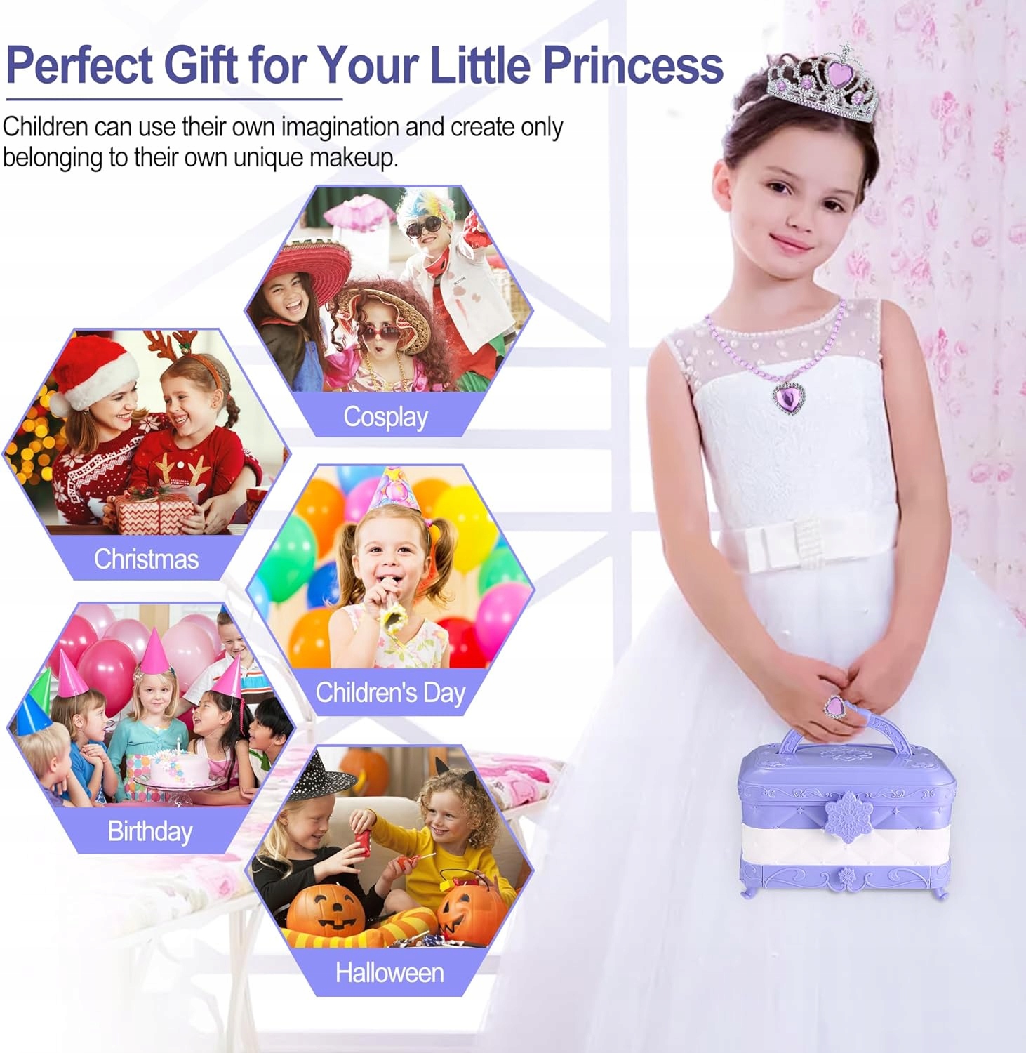 - макіяж 60 в 1 для дівчат: на комплект для макіяжу цієї дівчини містить усе, що вам потрібно. Він містить 18 тіней для очей, 7 блисків для губ, 5 шпильок до щок, 10 пензлів для макіяжу, 3 лаки для нігтів, 2 помади, 2 порошкоподібні щітки, 2 сережки з дорогоцінними каменями, 1 корона принцеси, 1 кольє з дорогоцінними каменями, 1 кільце з дорогоцінними каменями, 1 пальця сепаратора біля стопи, 1 файл до нігті, 1 світлове дзеркало: 1 косметолог