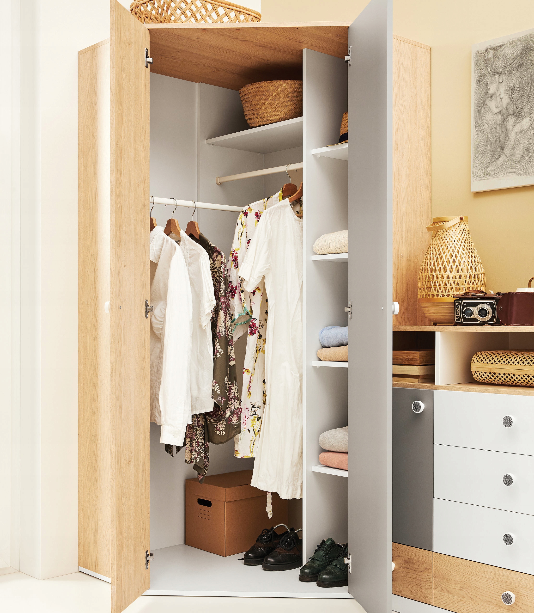- PIXEL – PX 02 – 90x190x90 – кутова шафа з полицями та штангами для одягу