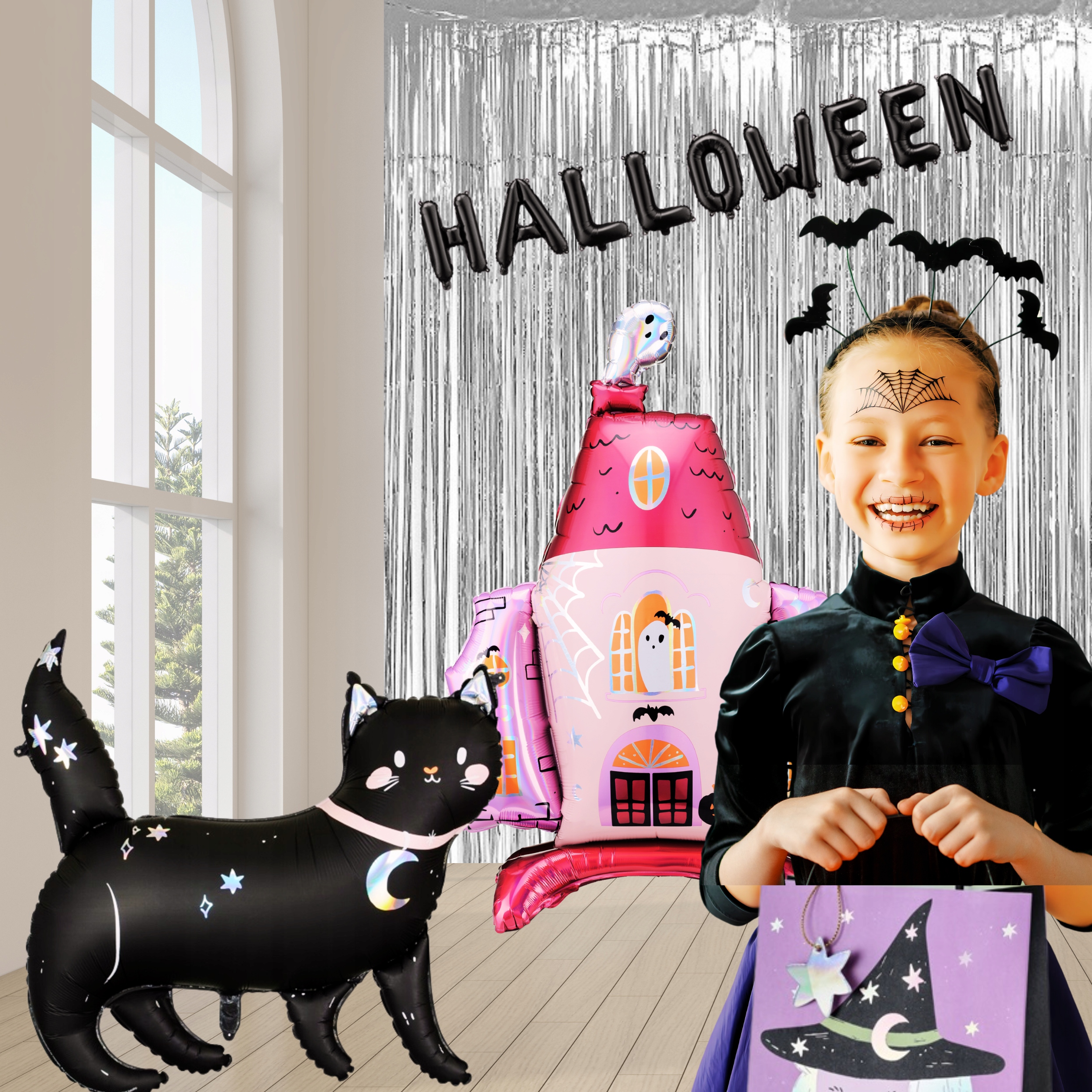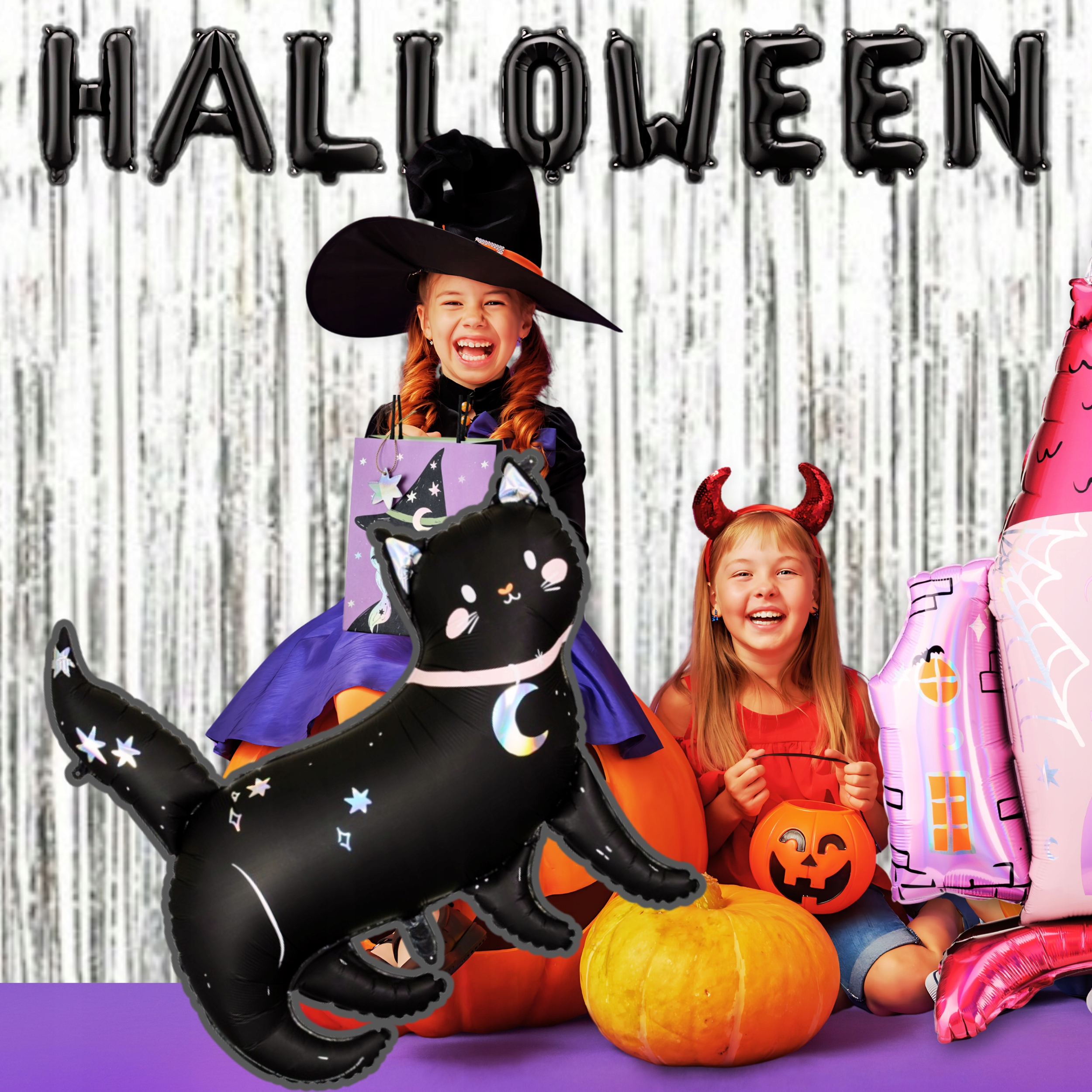 У набір входять повітряна куля Scary Castle, повітряна куля Black Cat, хеллоуїнський мішечок для маленьких цукерок, срібна шторка та ефектний напис «HALLOWEEN», які разом створюють ідеальну, цілісну композицію. Ви заощаджуєте час і отримуєте повний набір, який порадує як маленьких, так і великих шанувальників Хелловіну!