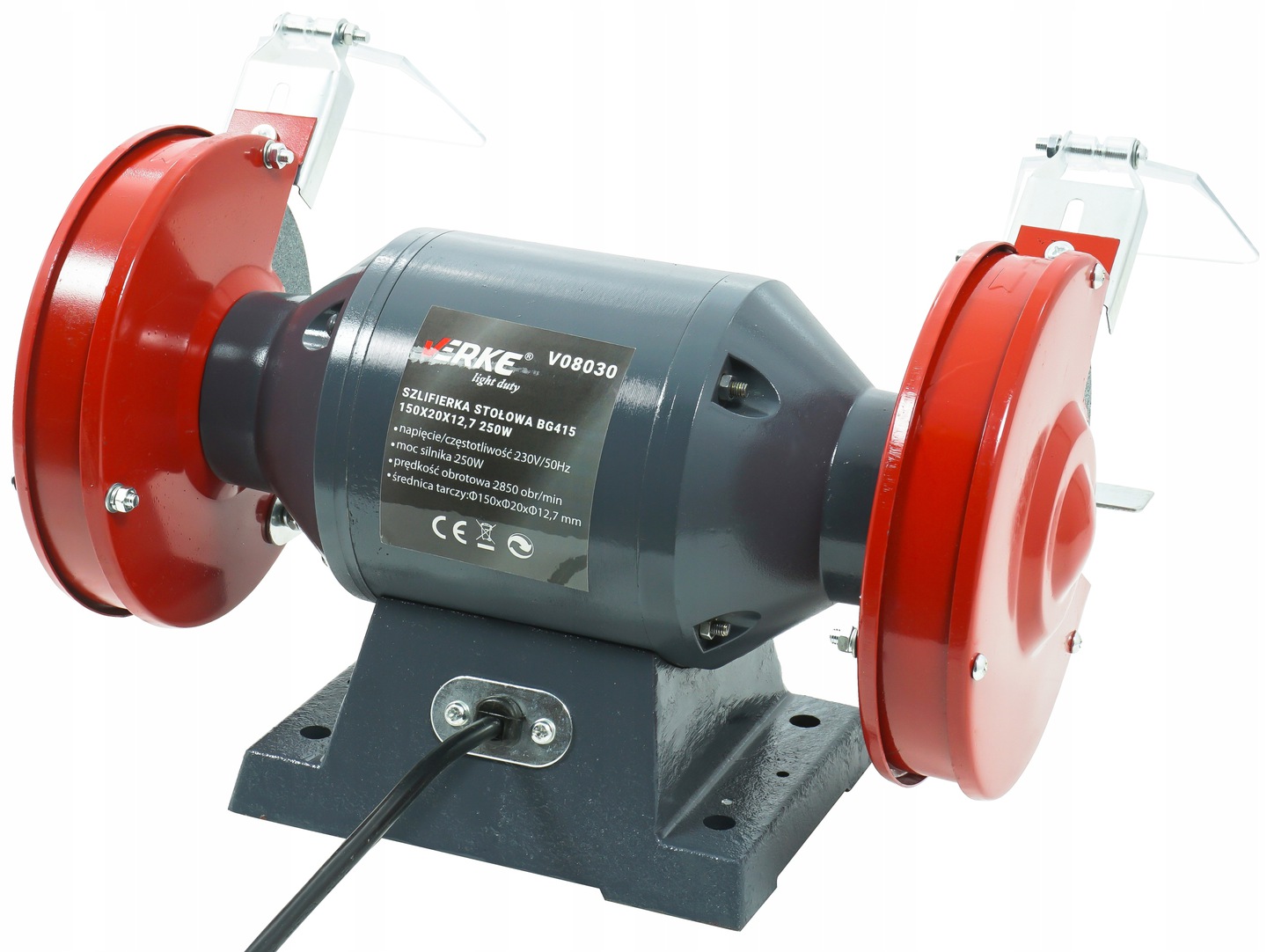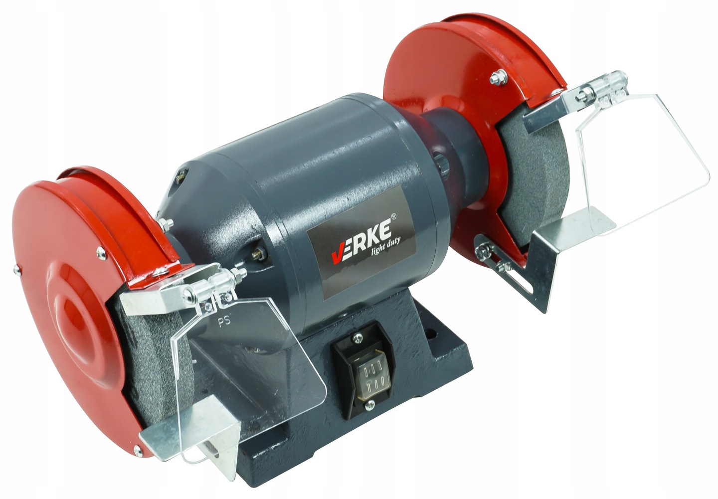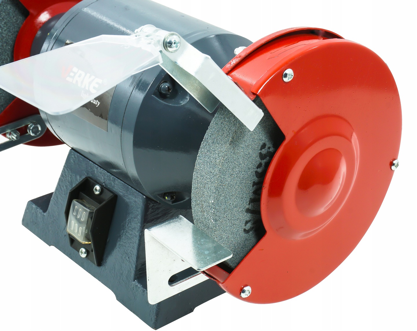 Високоякісна болгарка для заточування та шліфування VERKE. М'ясорубка має великі регульовані сітки для захисту від іскор і бризок, а також гумові ніжки, які забезпечують надійну опору та гасять вібрацію. Кришки з литого металу. Вимикач захищений від проникнення пилу. Плавний пуск забезпечує повний контроль під час роботи. Ідеально підходить для механічних і слюсарних майстерень.