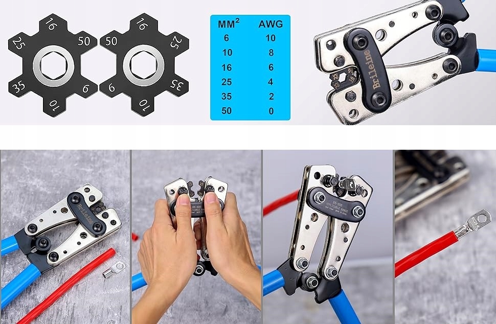 Великий обтискач кабельних наконечників Brileine 10-1/0 AWG, 8 розмірів