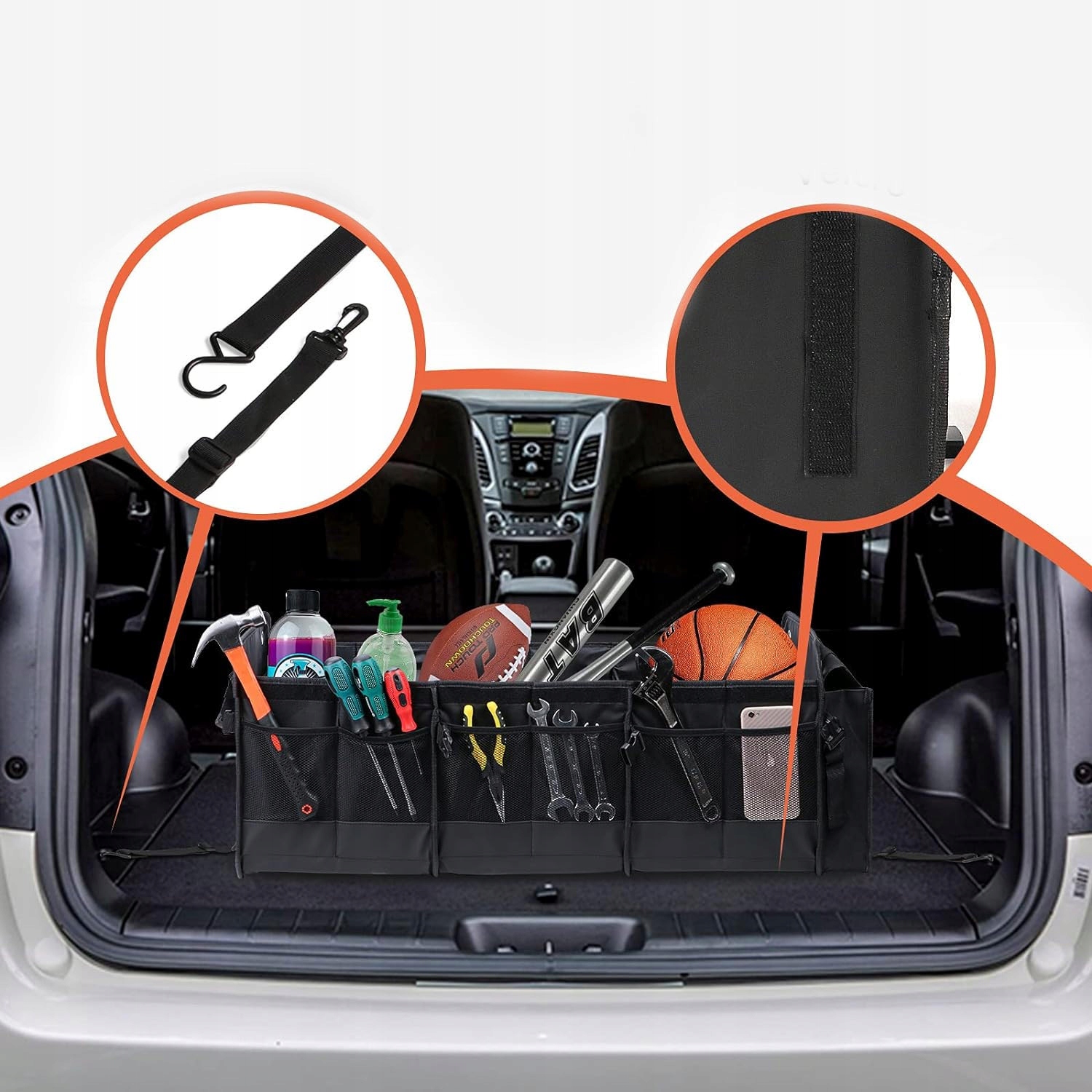 Внутрішня частина поділена на 3 відділення, а додаткові сітки, розміщені зовні, ідеально підходять для зберігання менших предметів. Поводитися з сумкою швидко, легко та без проблем. Має ручки, завдяки яким хват надійний і не зламається навіть при інтенсивному використанні. З його допомогою ви легко підтримуватимете порядок у багажнику свого автомобіля.